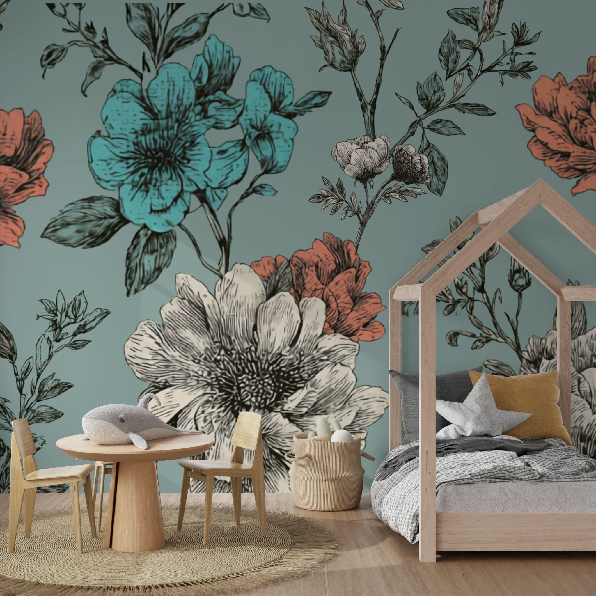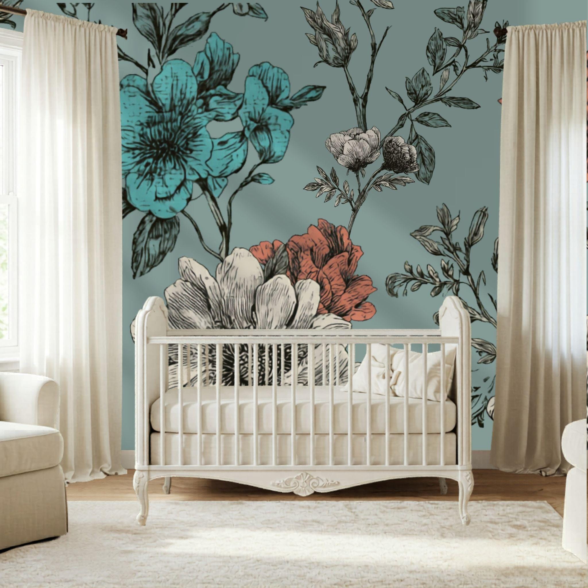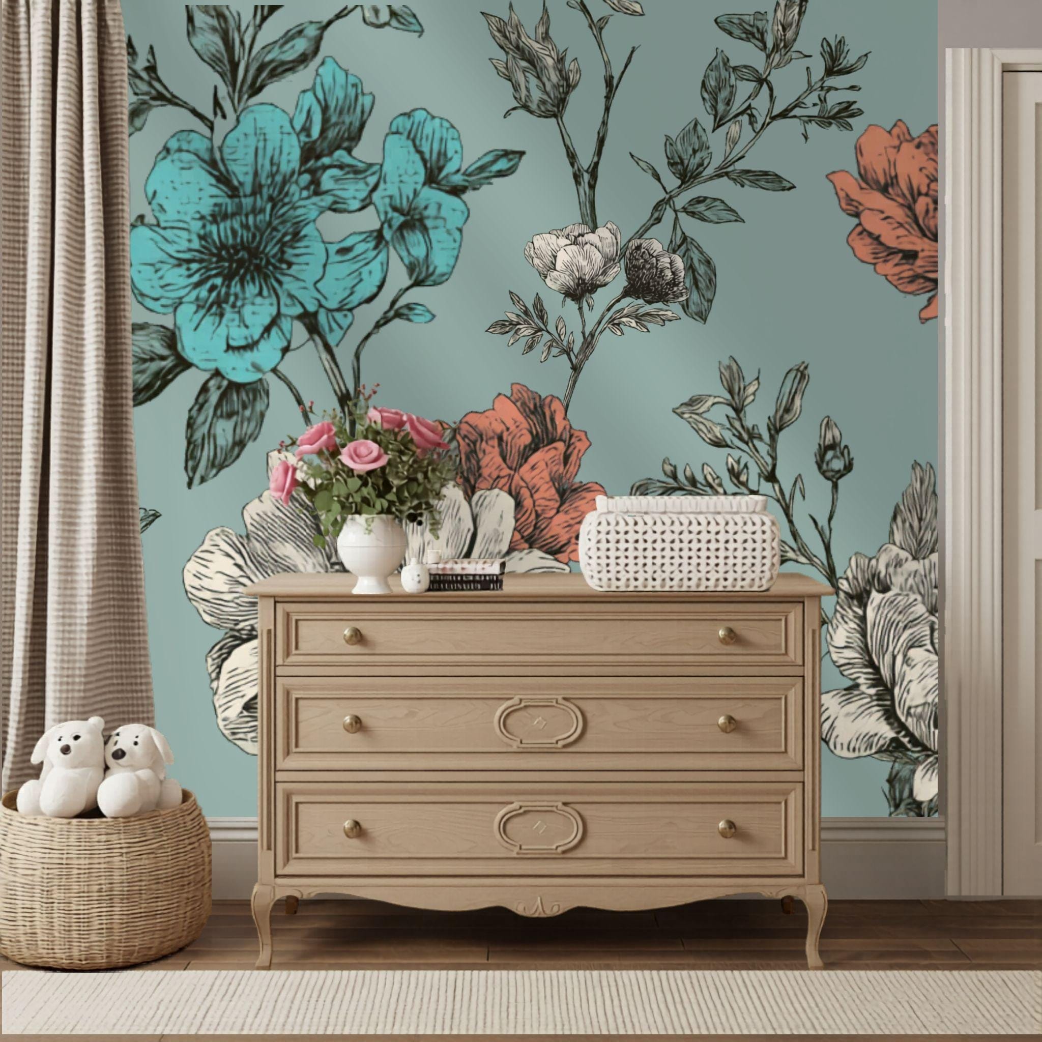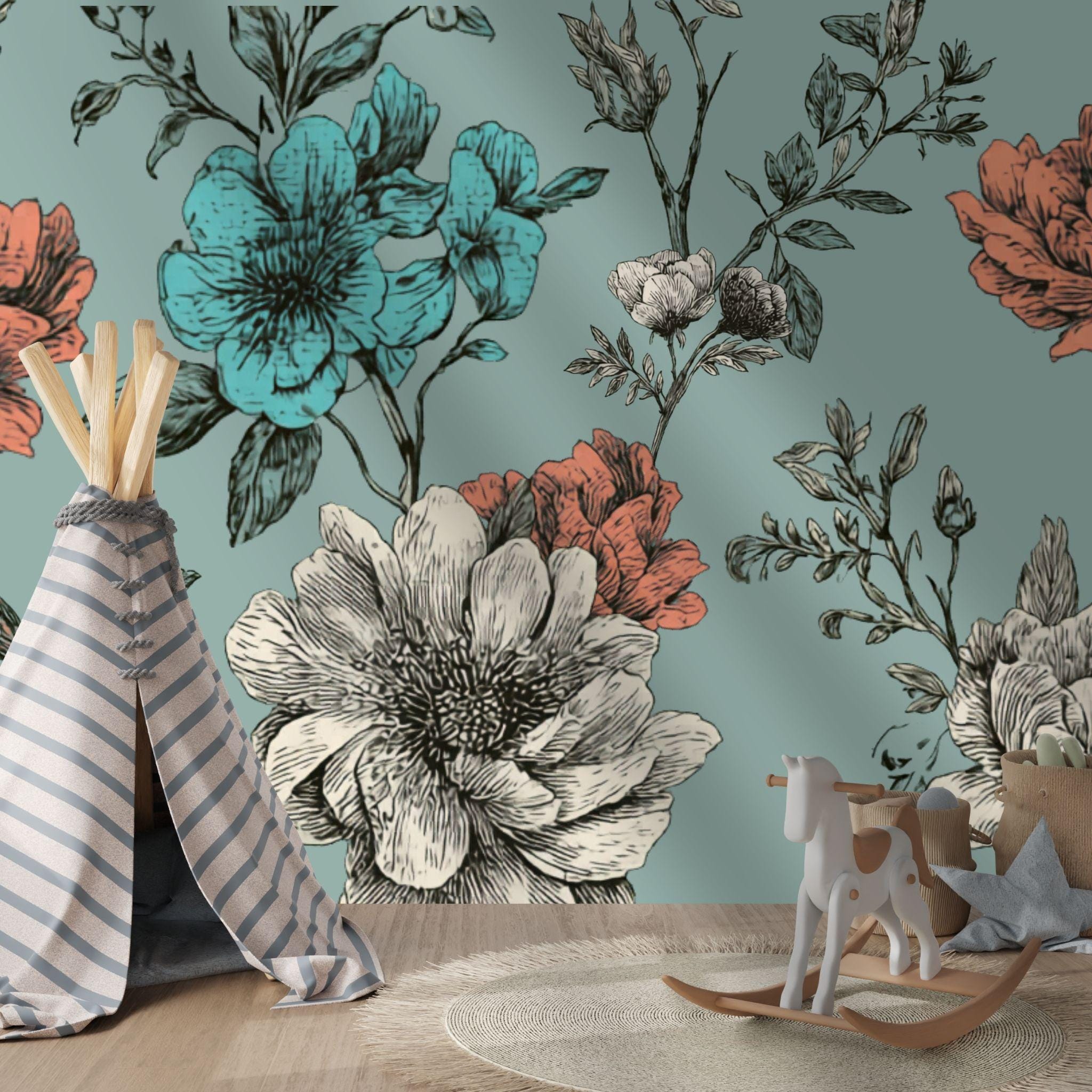 Turquoise Tea at Three | Nursery or Kids Room Wall Mural Digital Download, Large Floral Print File, Bold Home Decor