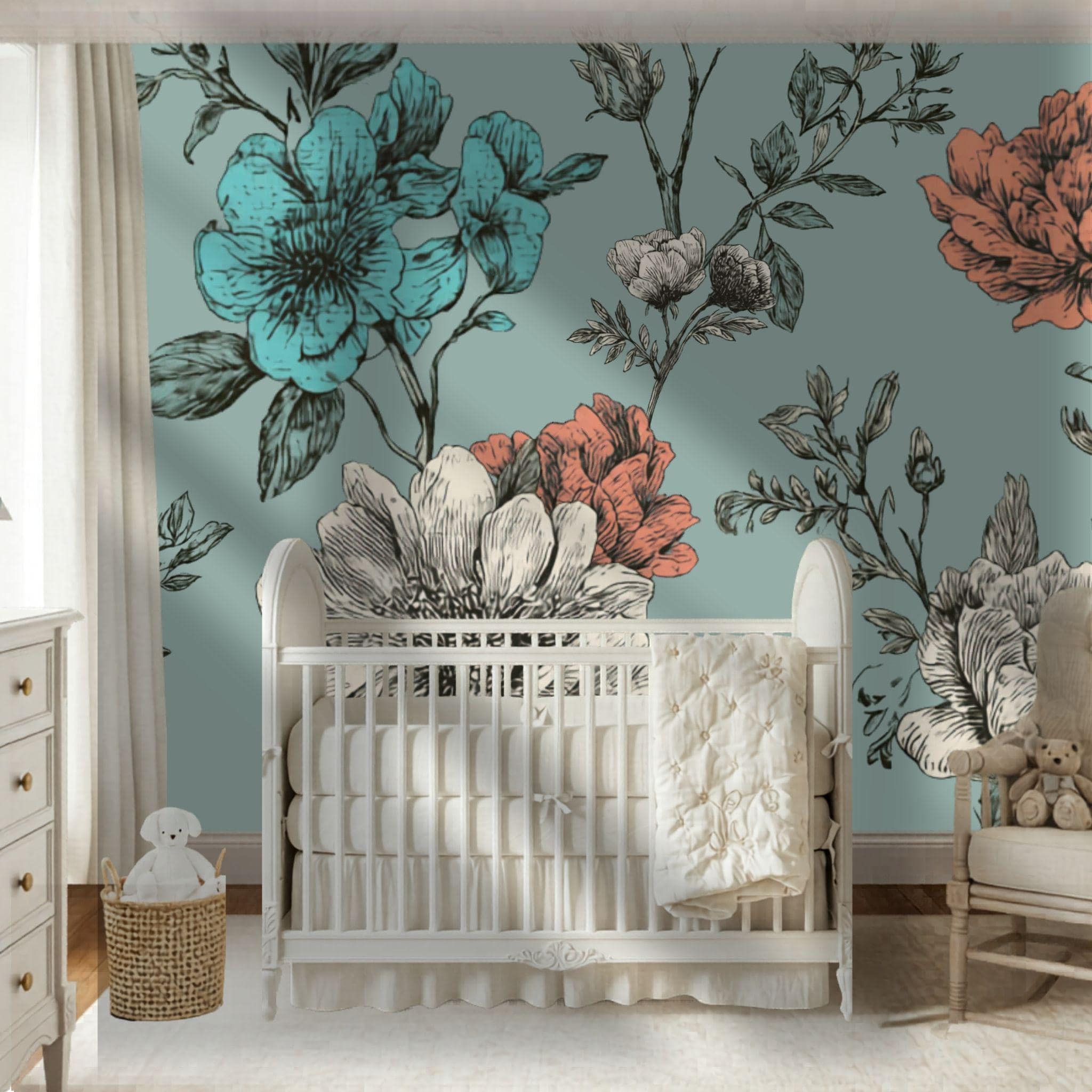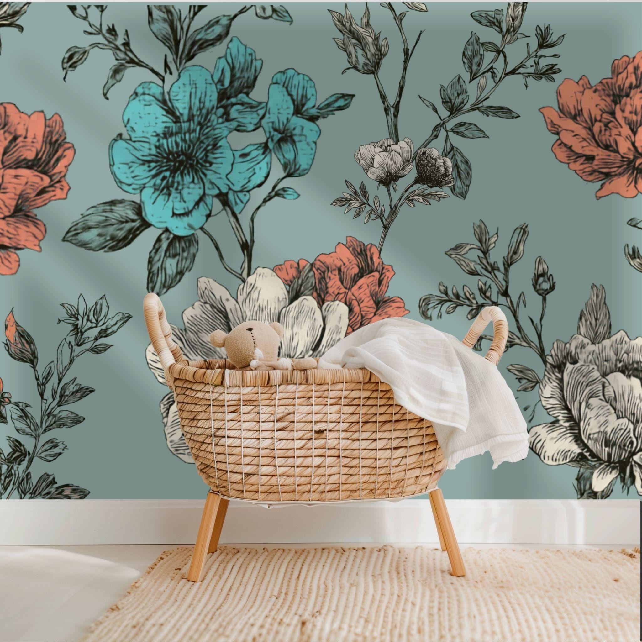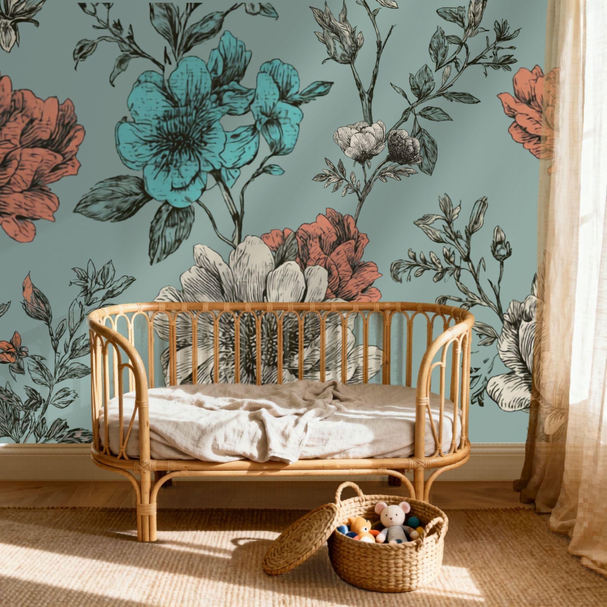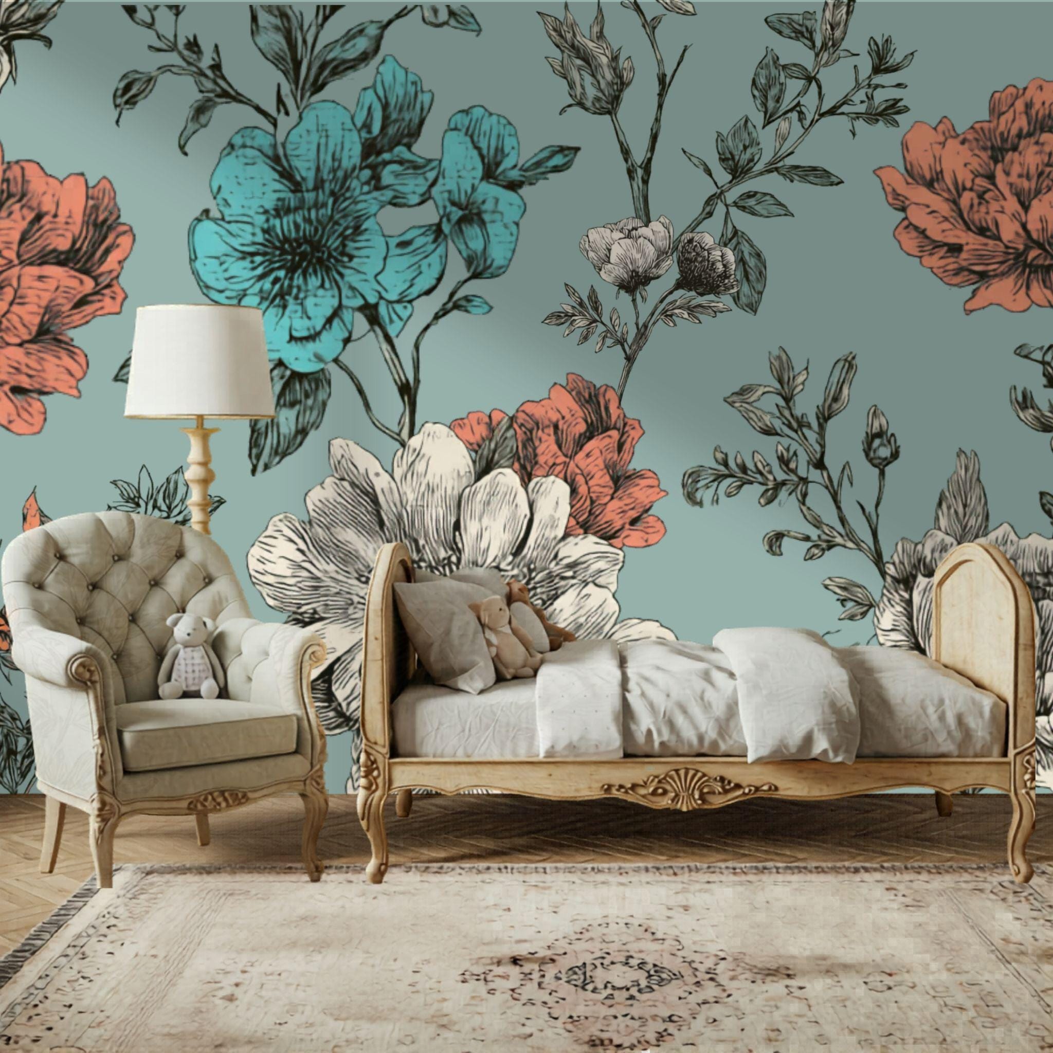 Turquoise Tea at Three | Nursery or Kids Room Wall Mural Digital Download, Large Floral Print File, Bold Home Decor