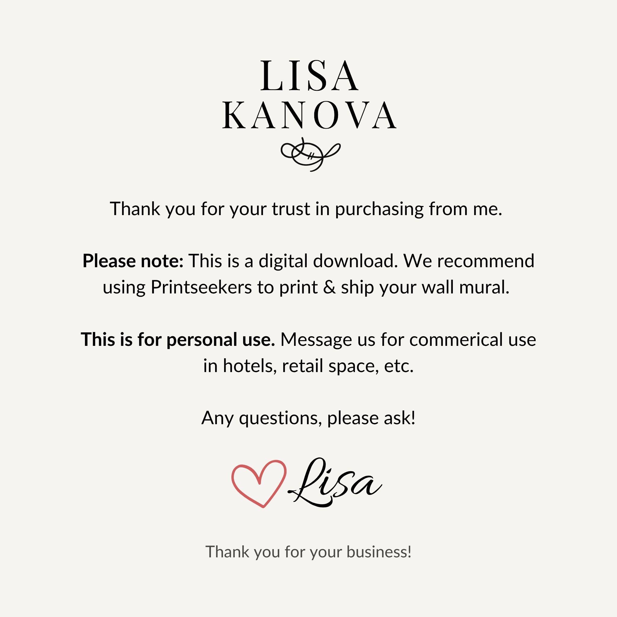This is a digital download; no physical product will be shipped. Lisa Kanova designs are for personal or specified commercial use only and are not for resale or redistribution.