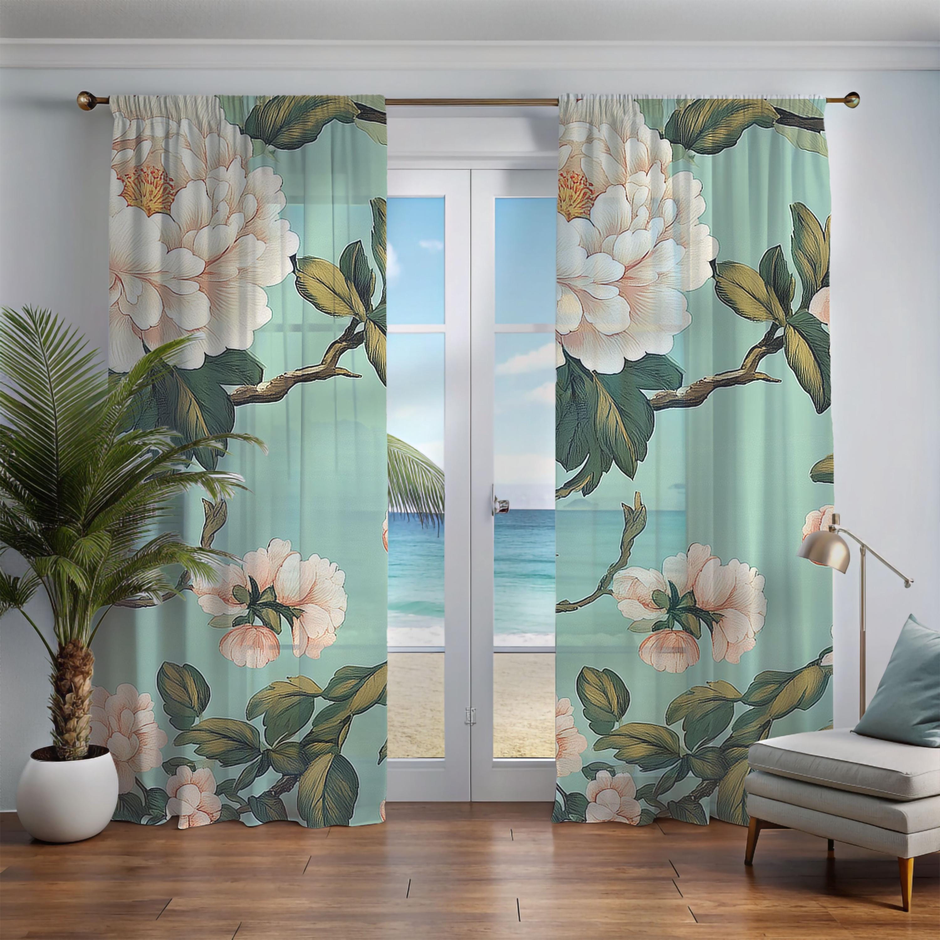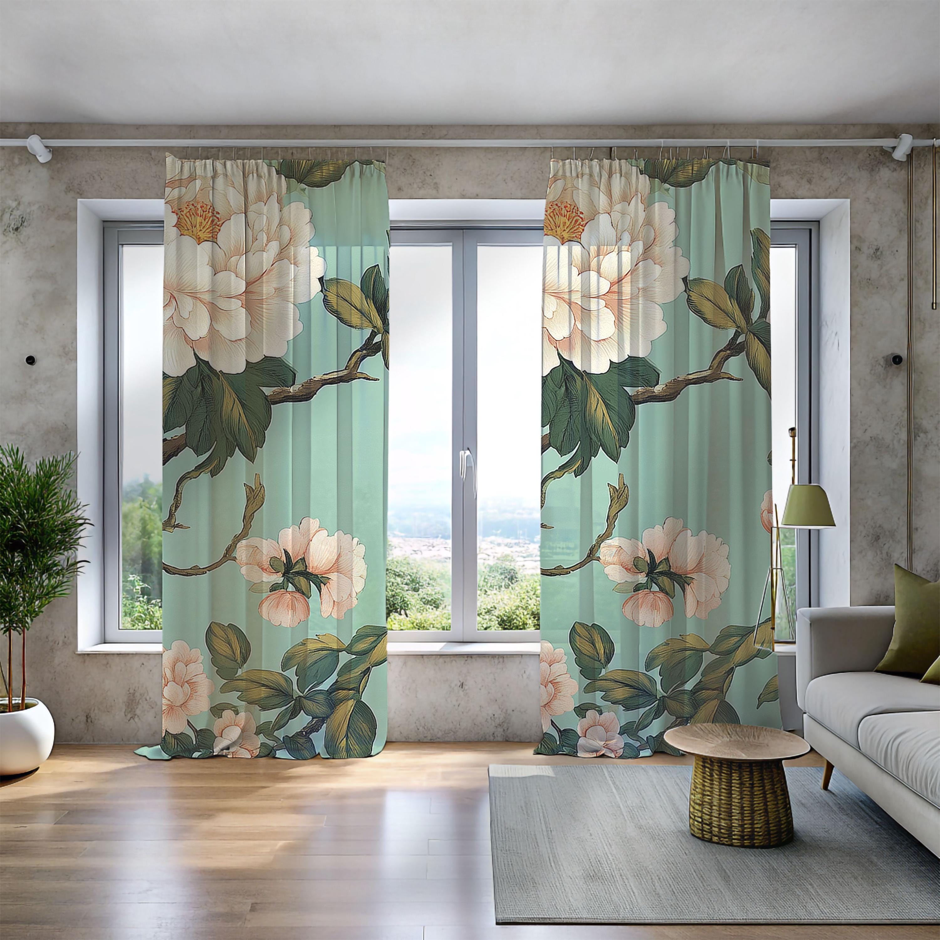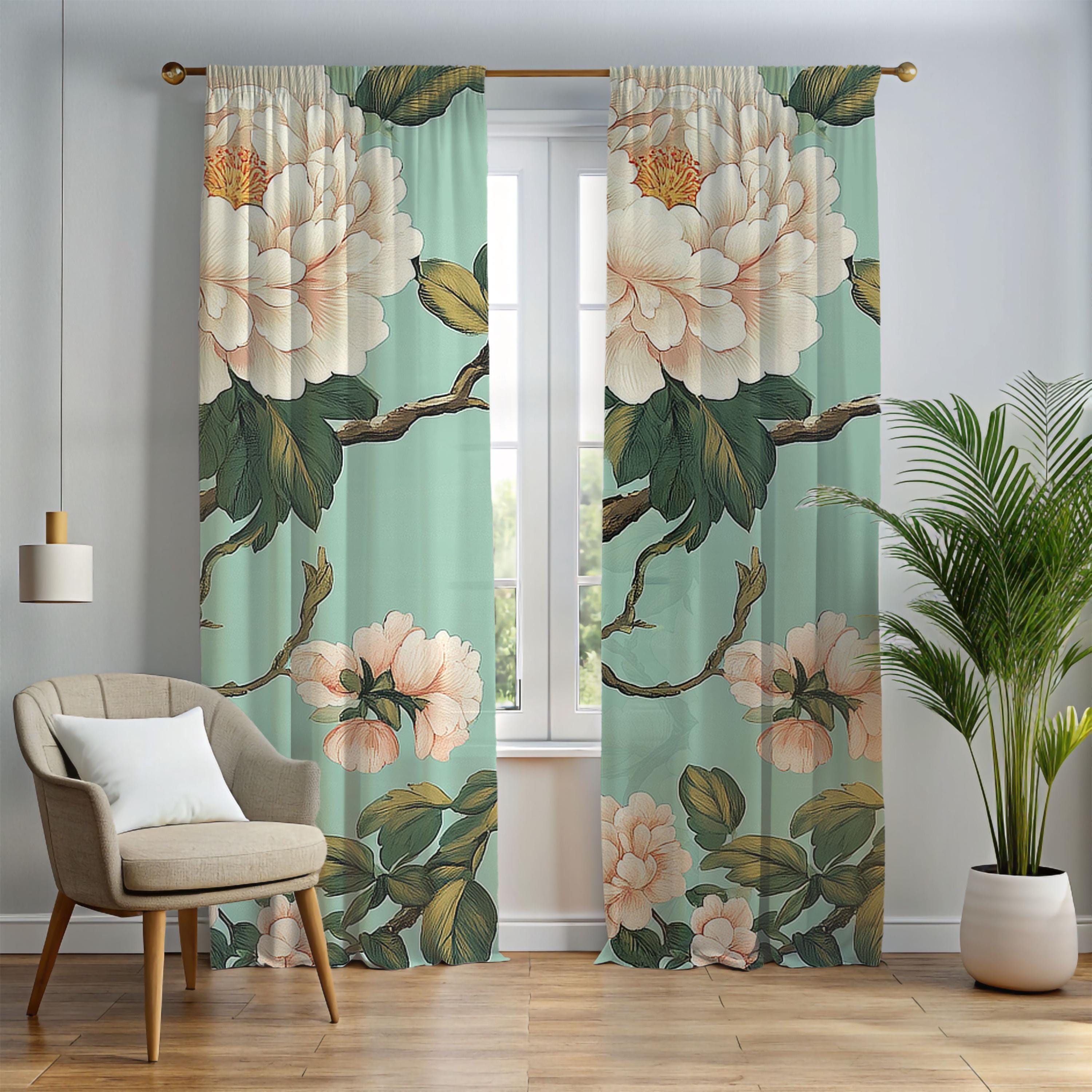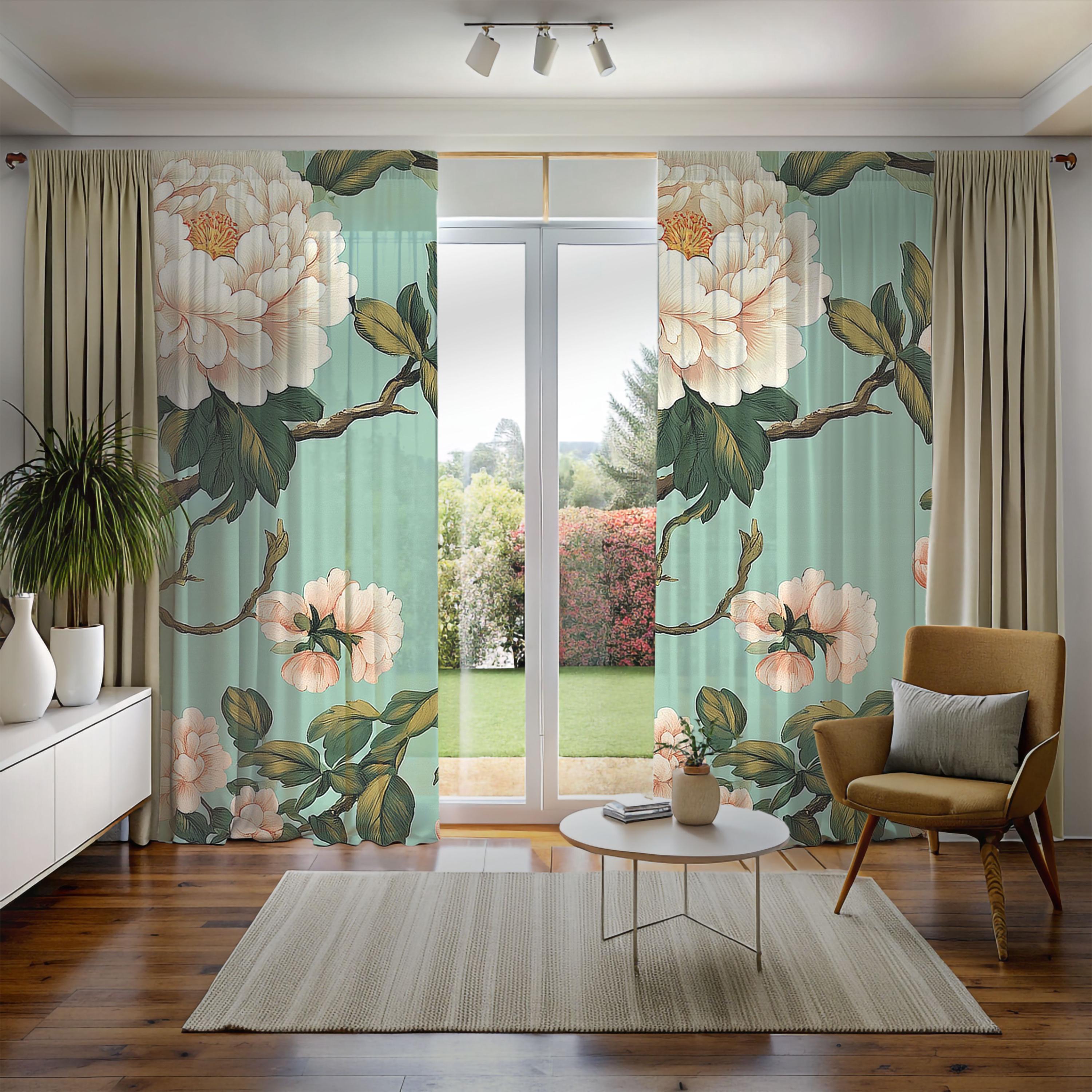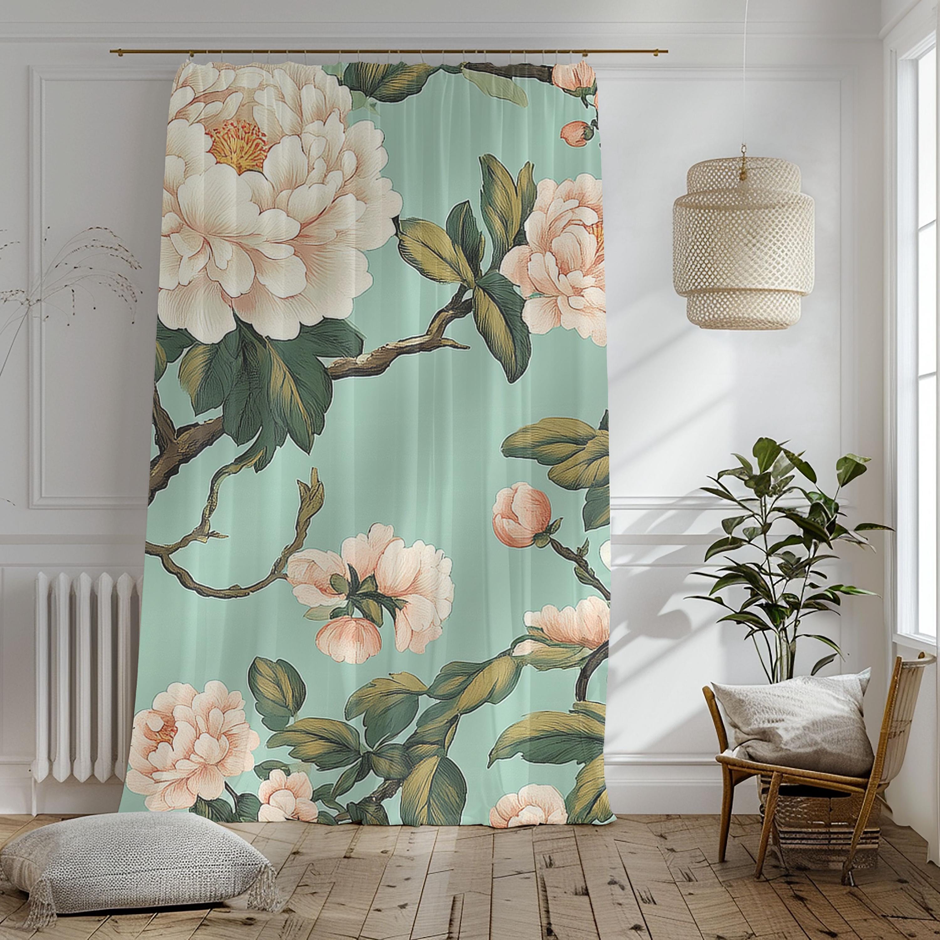 Luminous Sheer: Ideal for living and dining rooms. These panels filter natural light into a soft, ethereal glow, highlighting the painterly details of the artwork while maintaining an airy, breathable atmosphere.