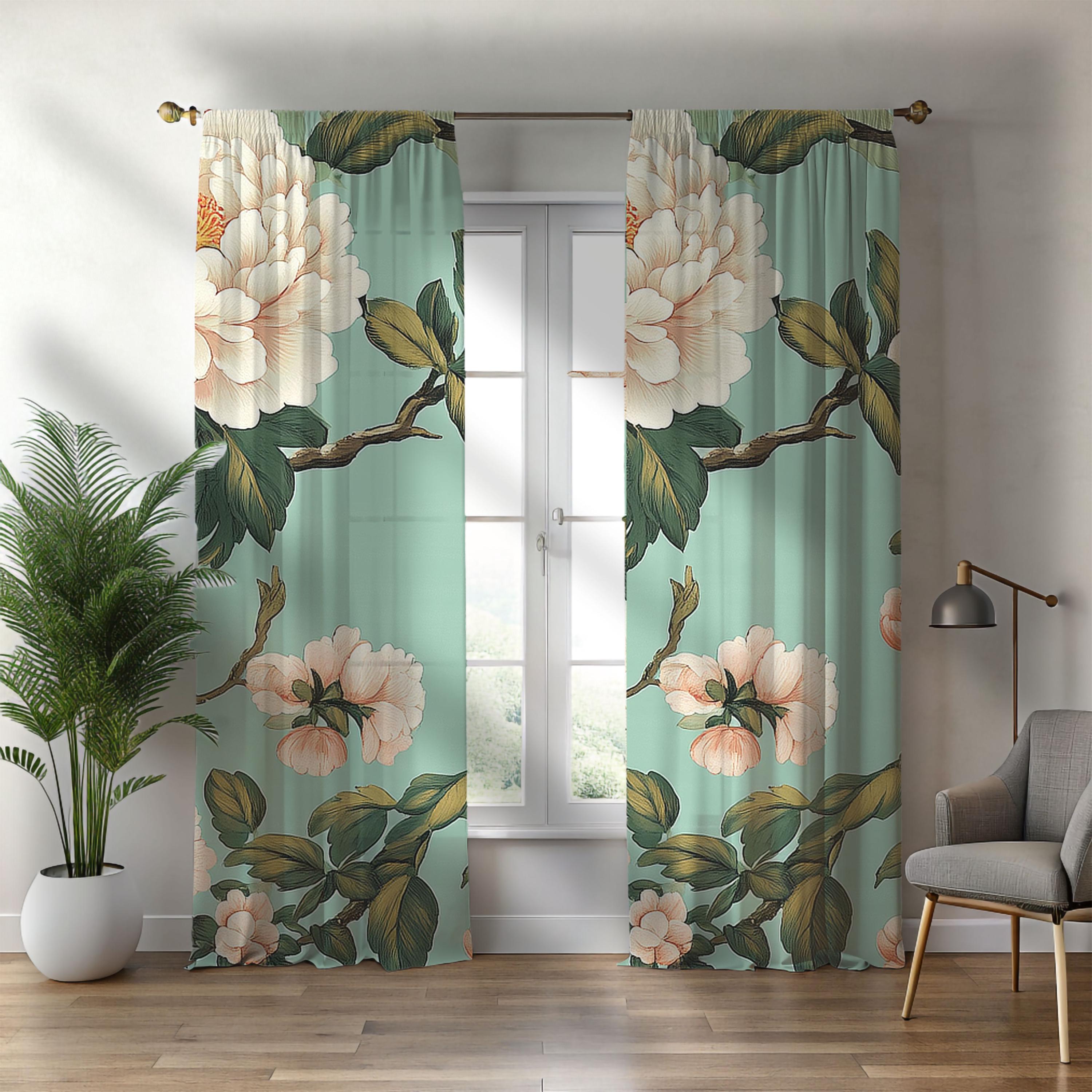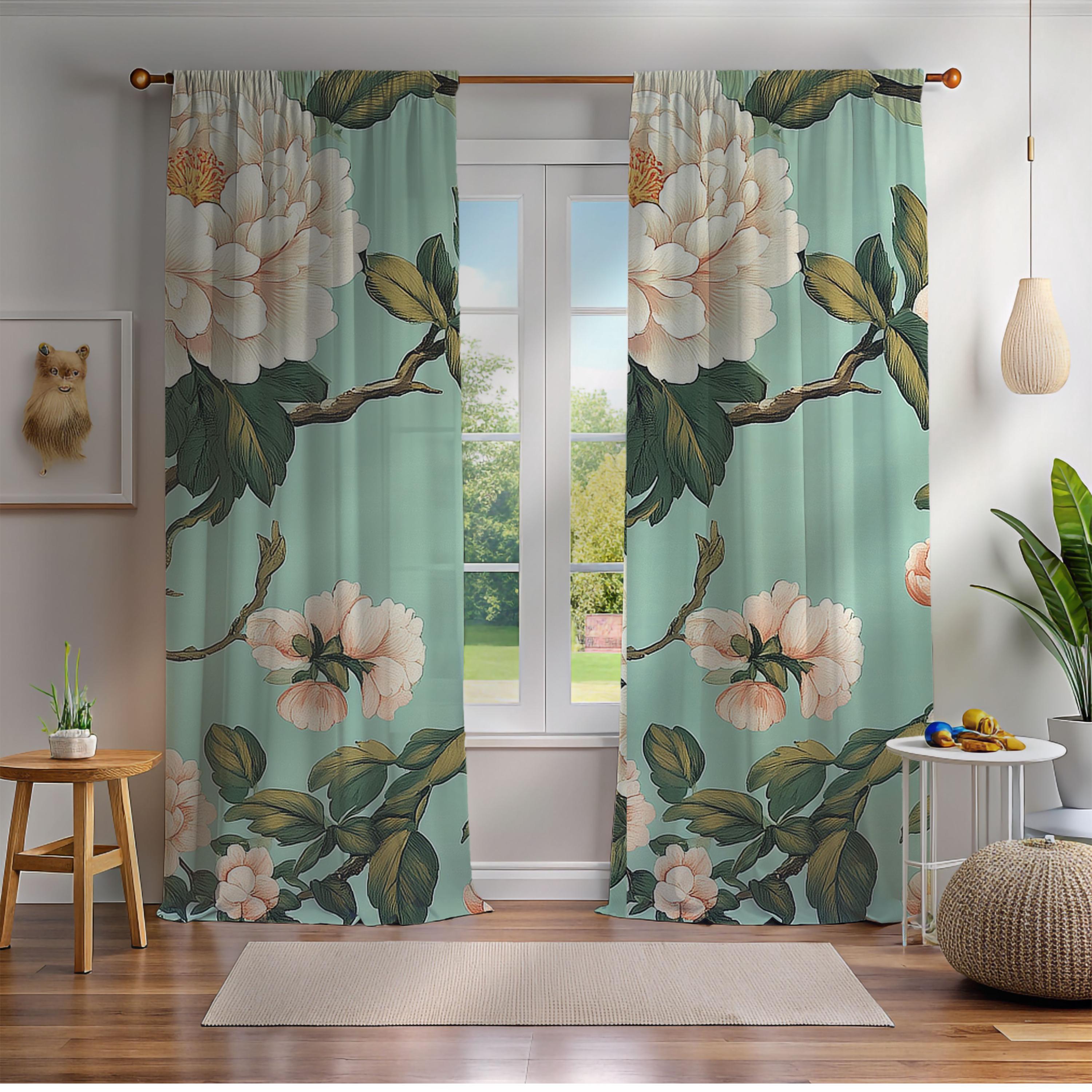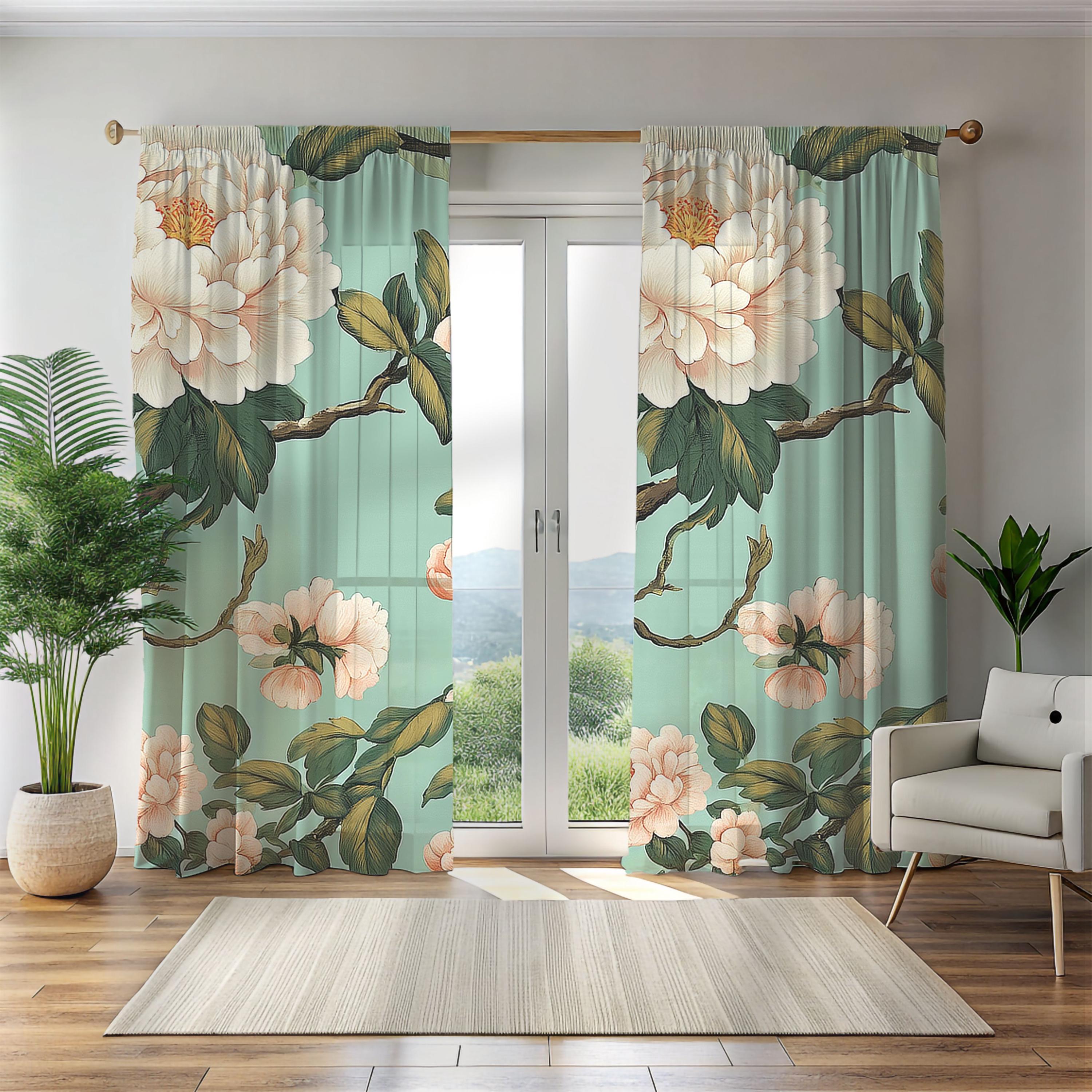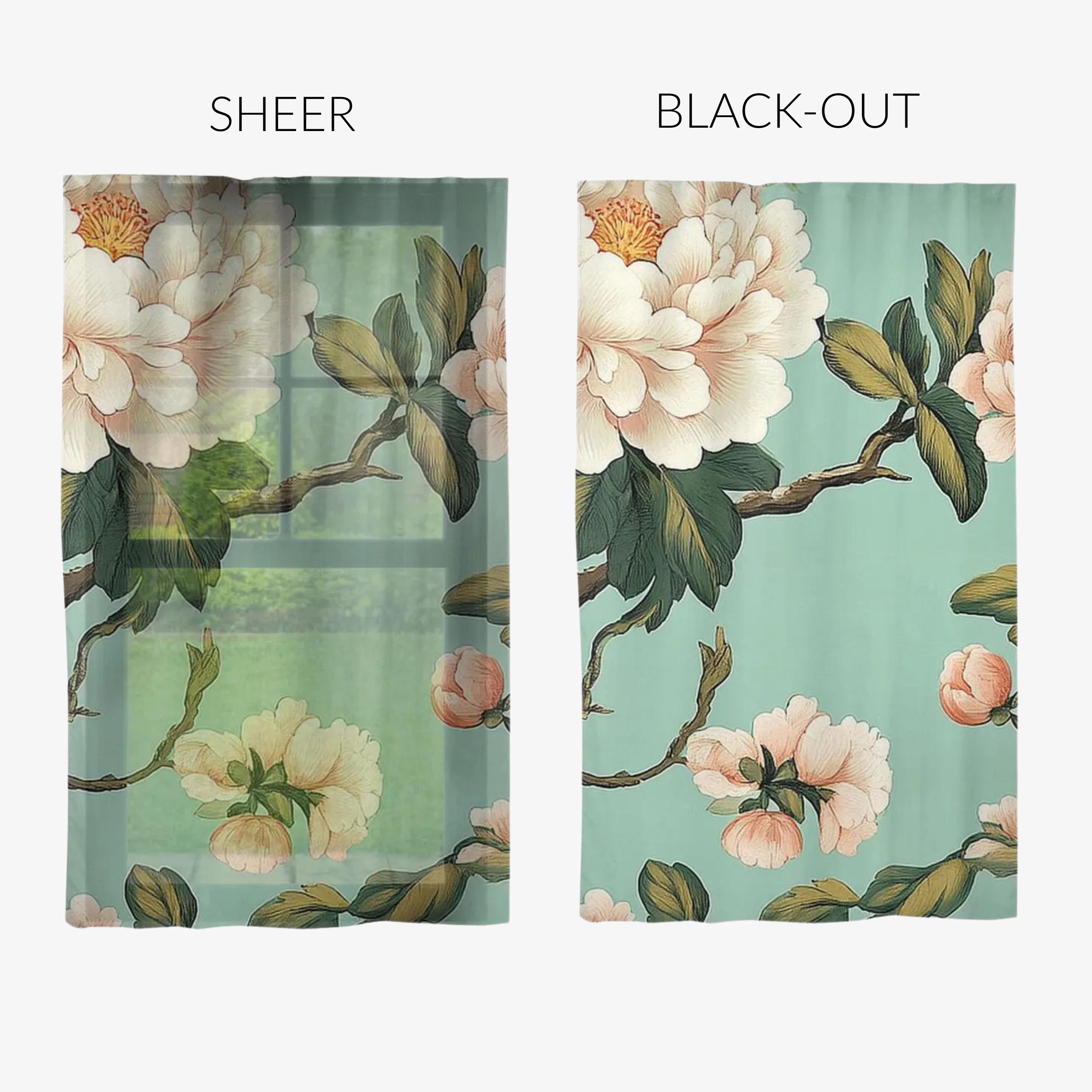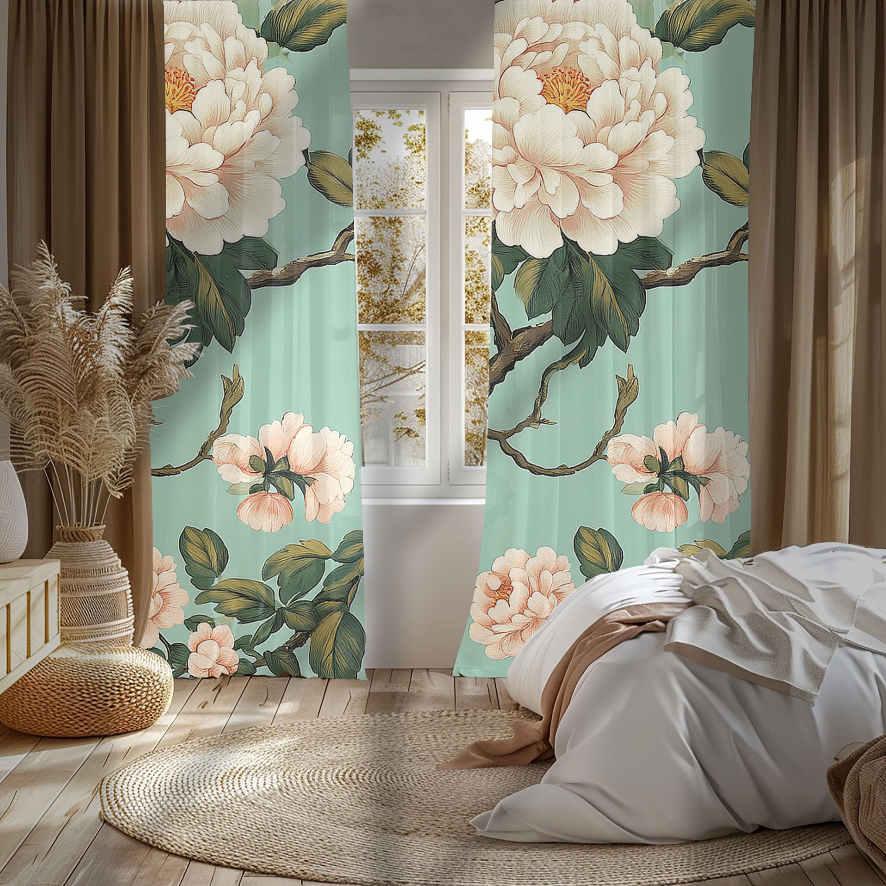 Luminous Sheer: Ideal for living and dining rooms. These panels filter natural light into a soft, ethereal glow, highlighting the painterly details of the artwork while maintaining an airy, breathable atmosphere.