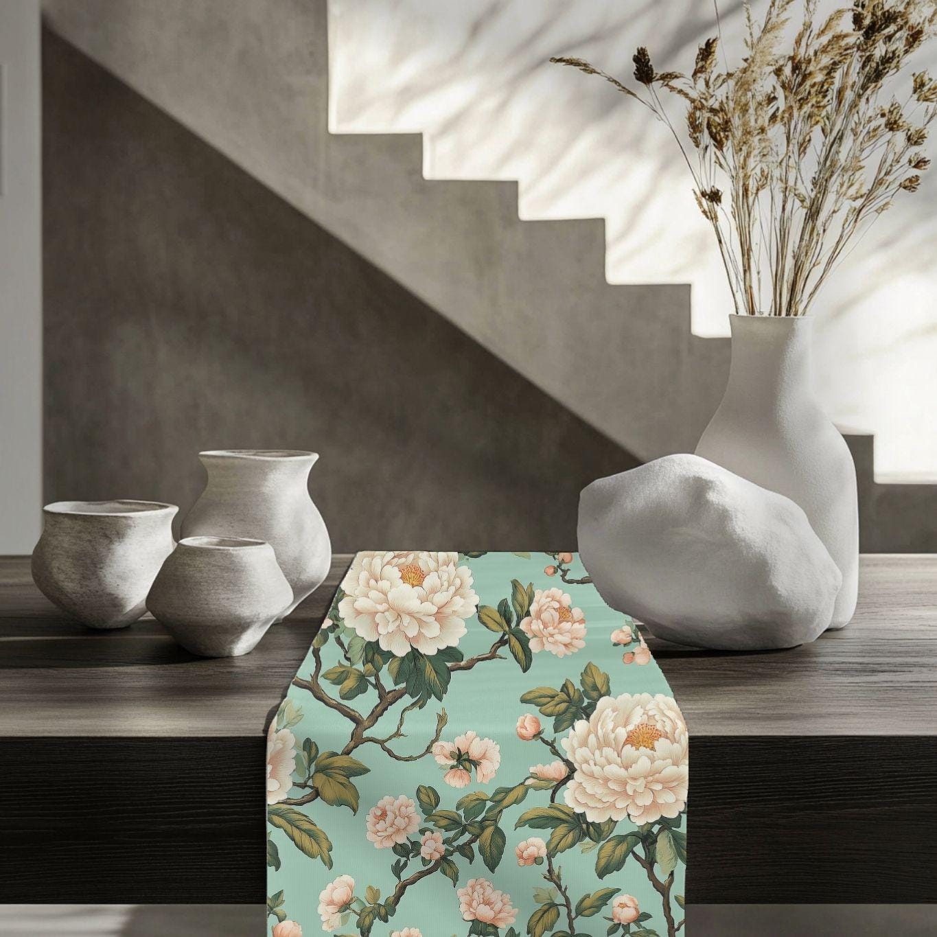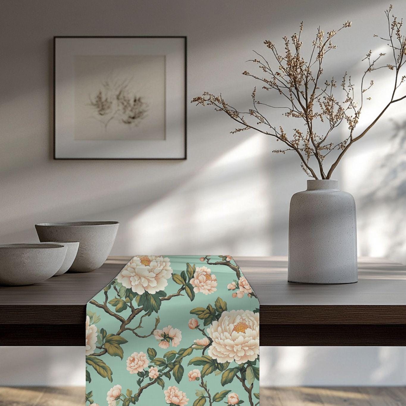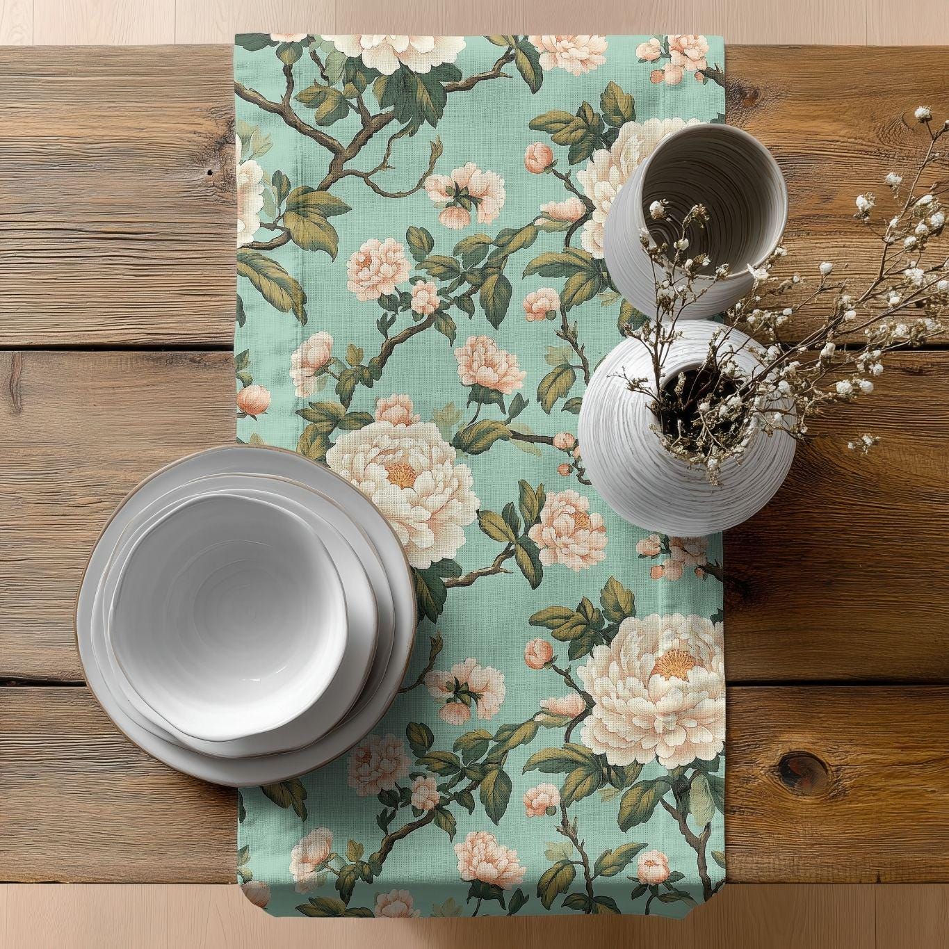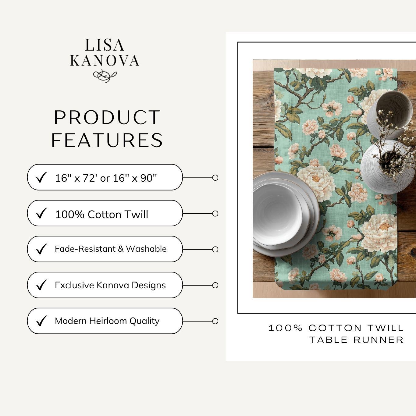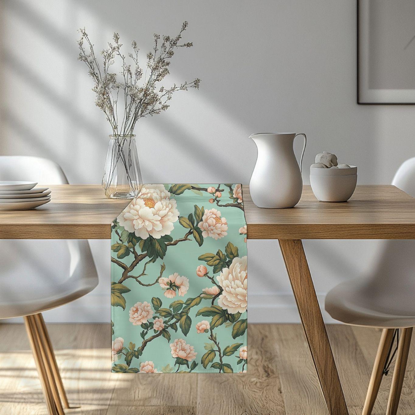 A soft, floral table runner that brings a quiet, vintage garden into your dining room. The pale teal background and hand-drawn cream blossoms create a layered, painterly look that feels collected rather than manufactured. It lays long and elegant down the center of a wooden table, framing place settings and catching light across its subtle blooms. Choose the polyester option for vivid, high-contrast color that resists wrinkles and dries fast, or the cotton twill for a softer, muted finish and classic texture. Hemmed edges keep the piece looking tidy through many seasons of use.