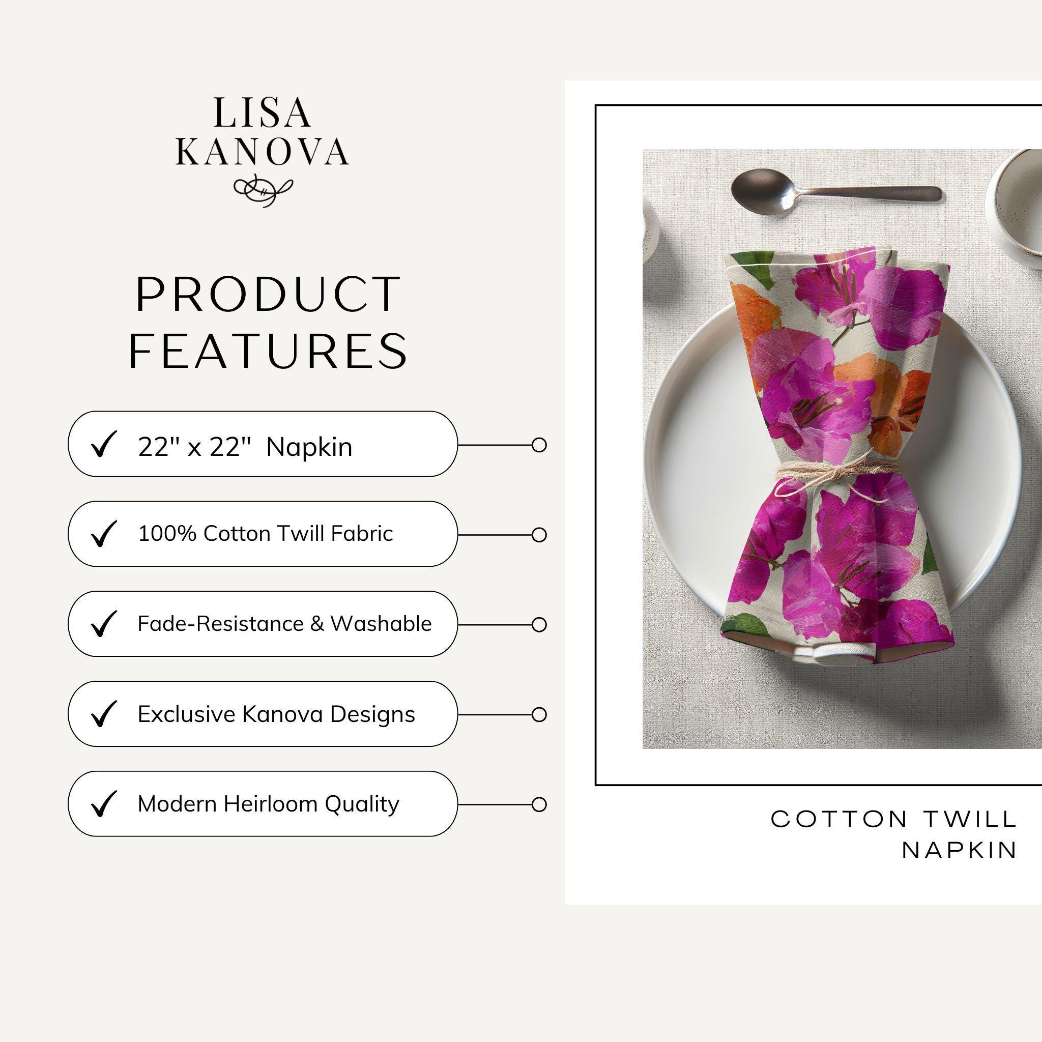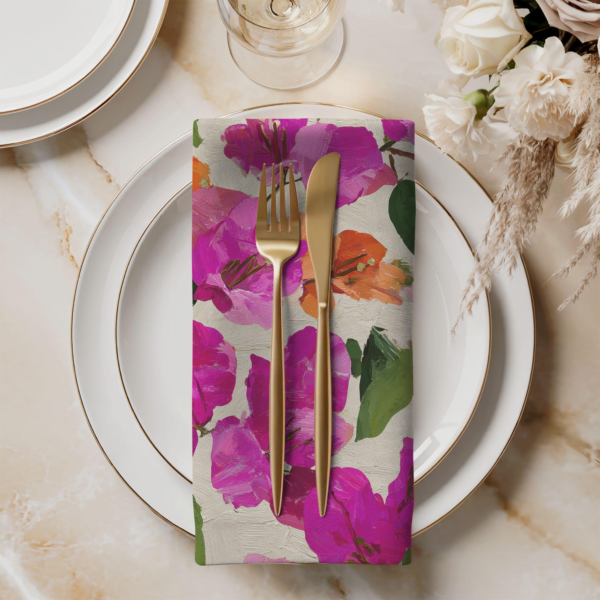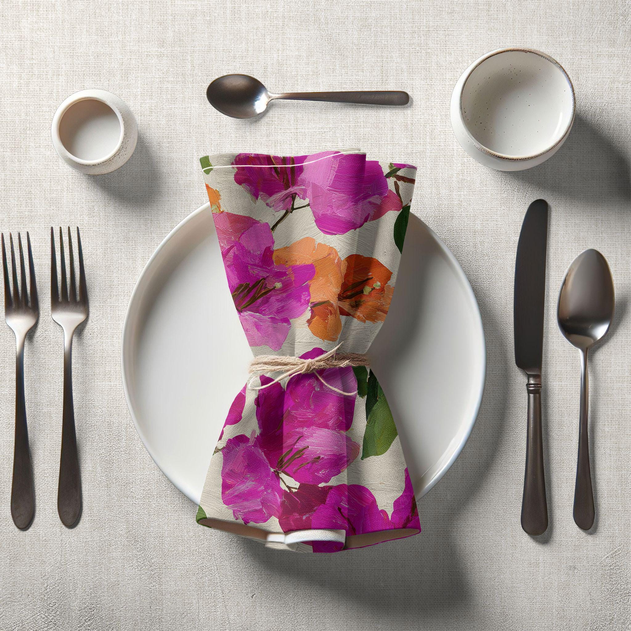 Bright, painterly blooms splash across a sturdy cotton twill napkin, bringing warm, joyful color to everyday meals and relaxed gatherings. The lively magenta and tangerine flowers feel hand-brushed, set against a soft neutral ground that lets the print sing without shouting. Durable hemmed edges and fade-resistant fibers mean this napkin will soften beautifully with use while keeping its vibrant spirit. Tuck it into a picnic basket, layer it beside a vintage plate, or let it lift a weekday dinner with the kind of cheerful energy that invites conversation and slow moments.