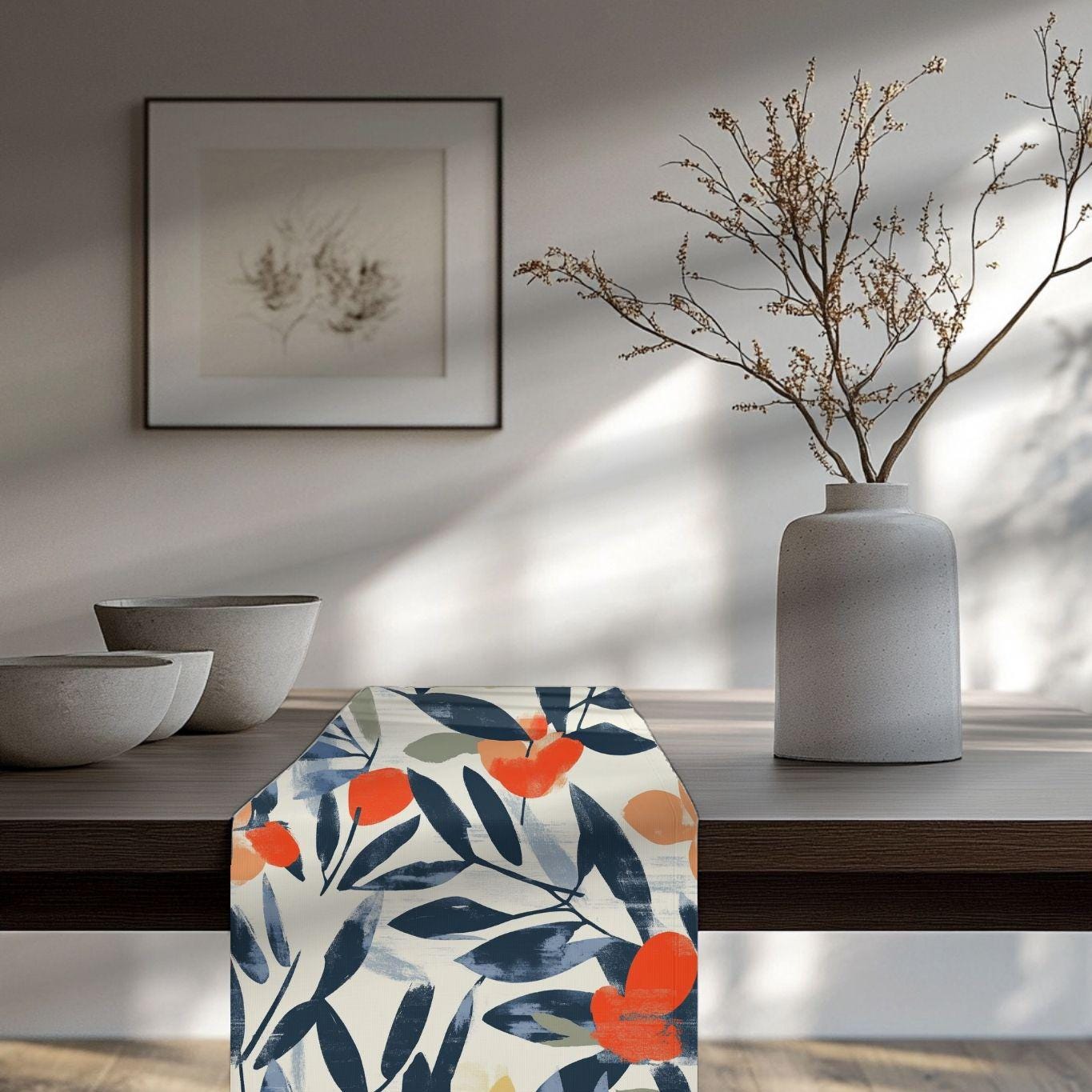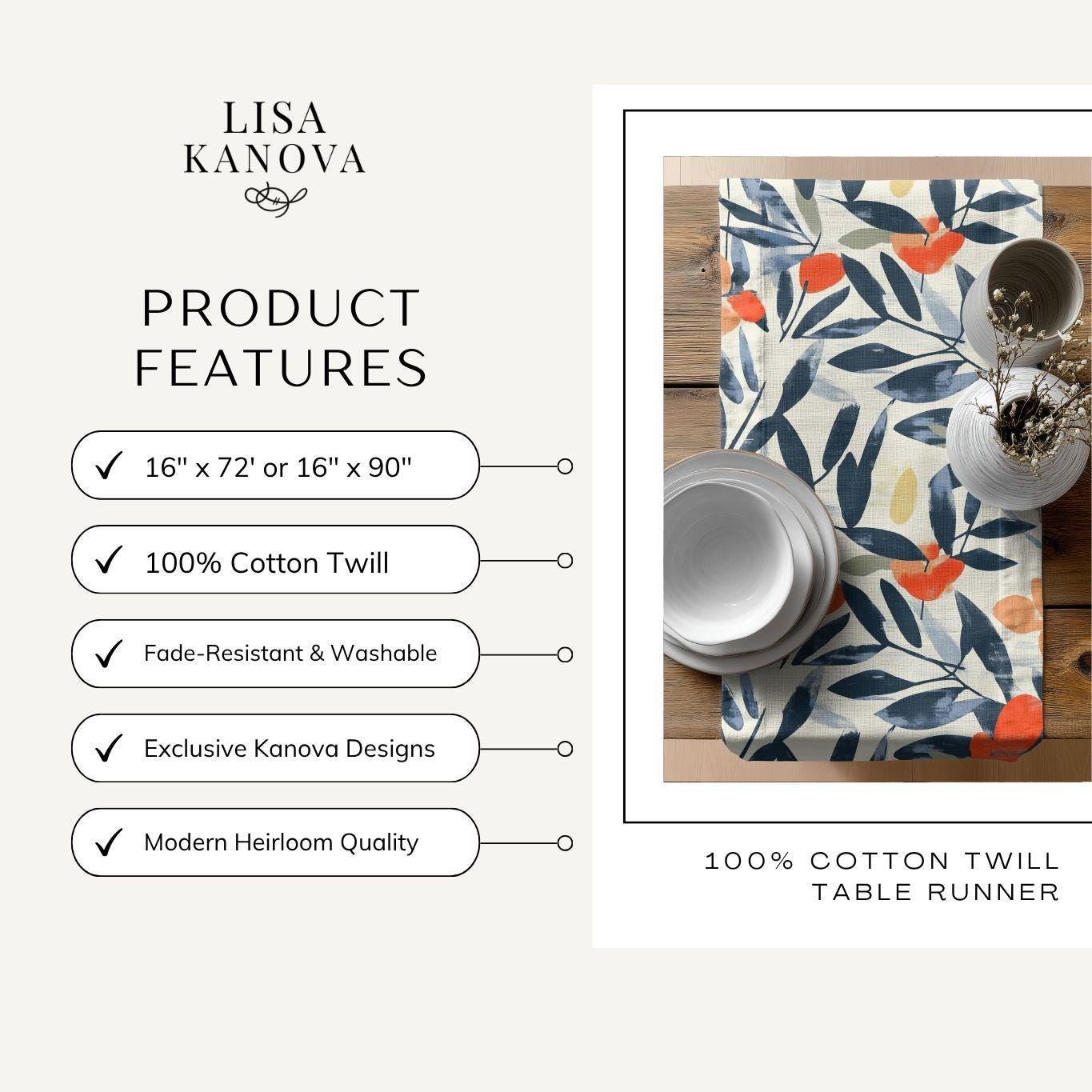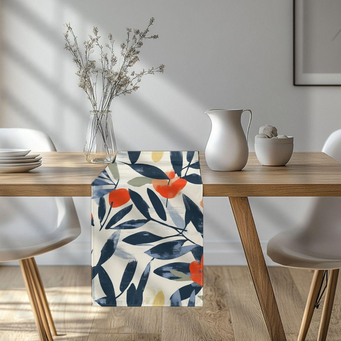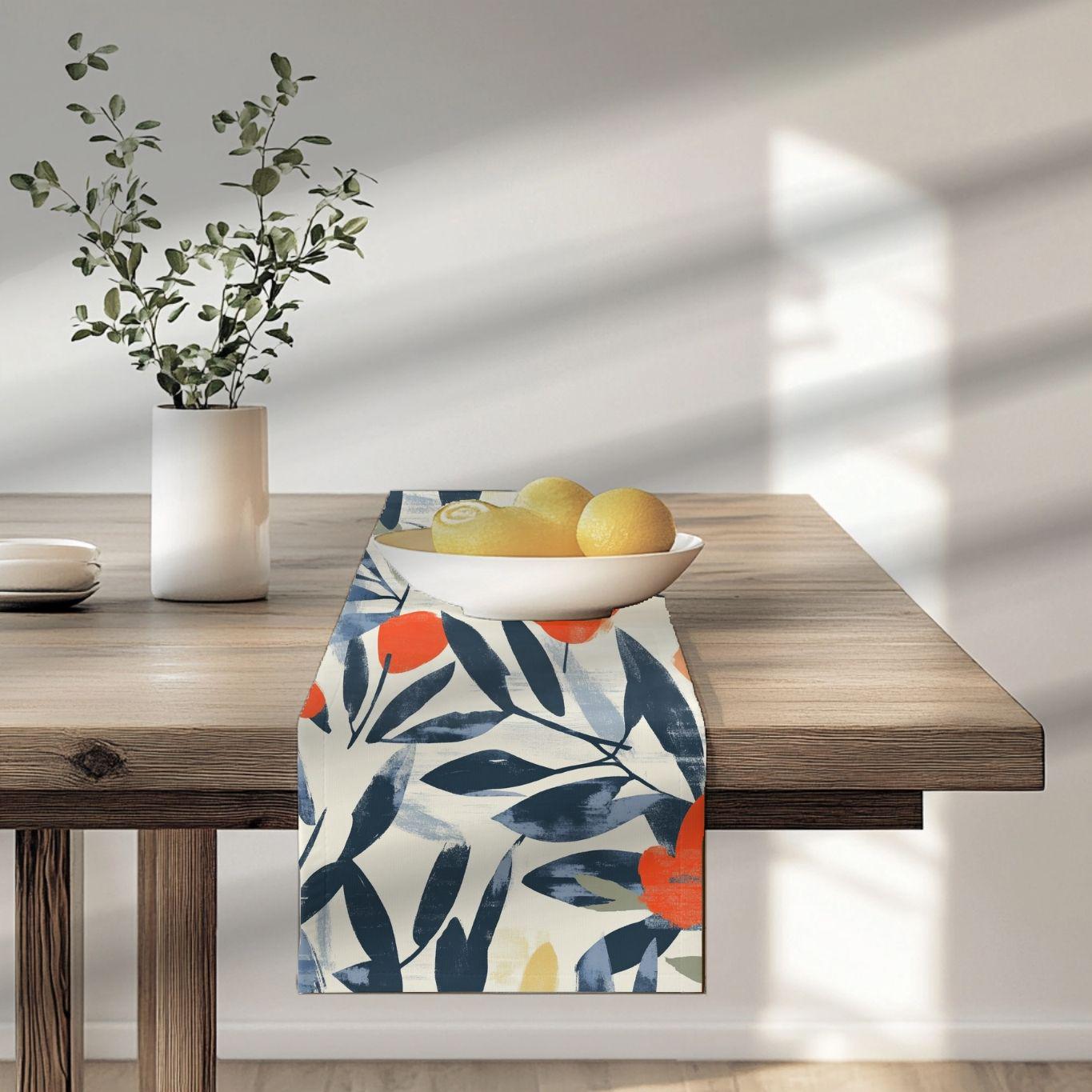 Soft, painterly botanicals stretch along this narrow table runner, bringing a calm, gallery-style touch to everyday tables. Brushstroke leaves in deep navy frame warm coral blooms and muted chartreuse accents on a gentle ivory ground. Lightweight and drapey, it lays neatly down the center of a dining or console table and lets layered textures — wood grain, linen napkins, hammered metal — take the spotlight. Use the cotton twill option when you want a subtle, classic look with a matte finish; choose polyester for punchier, high-contrast color that stays vivid through regular use. Hemmed edges hold the shape, and the one-sided print keeps the underside clean for easy pairing with other linens.