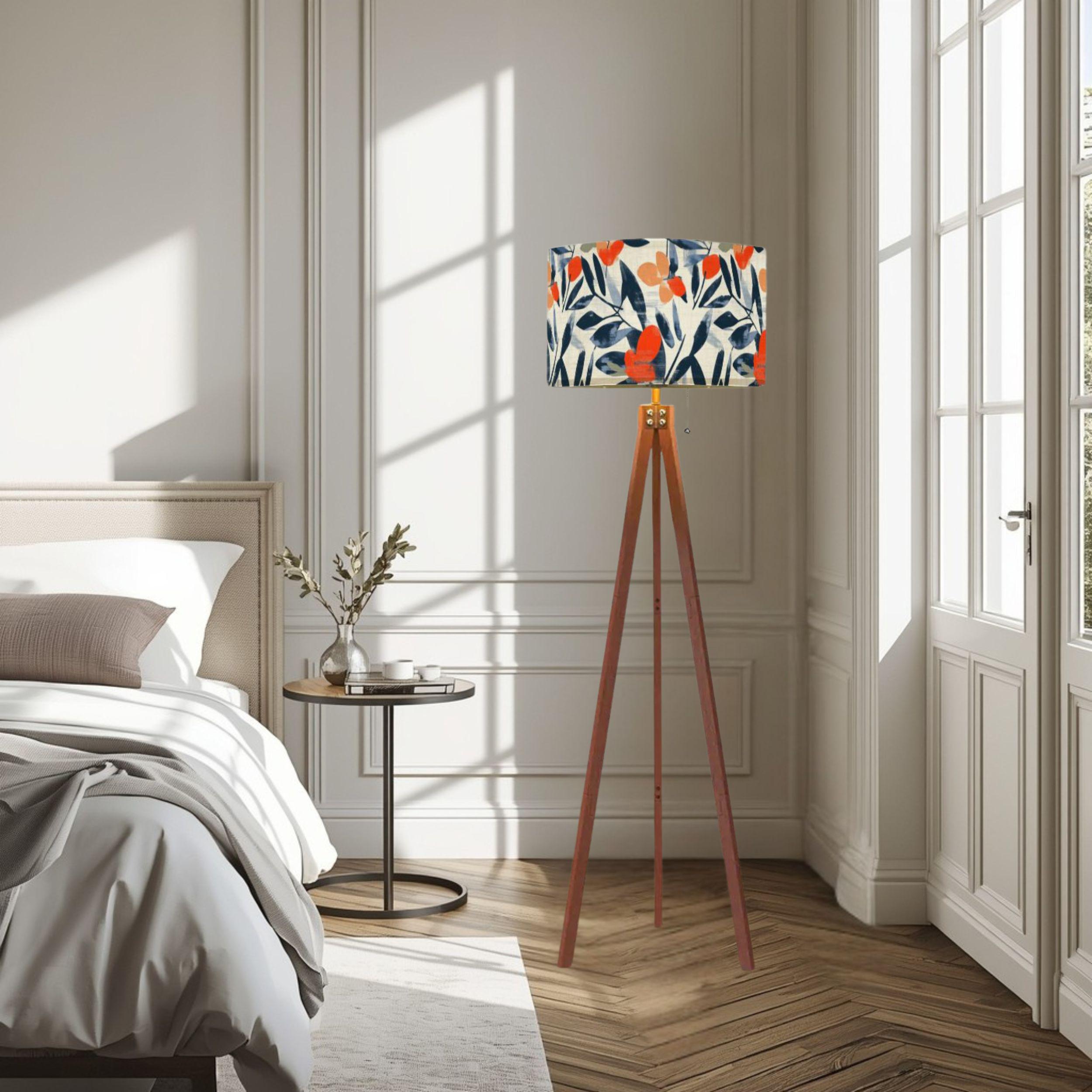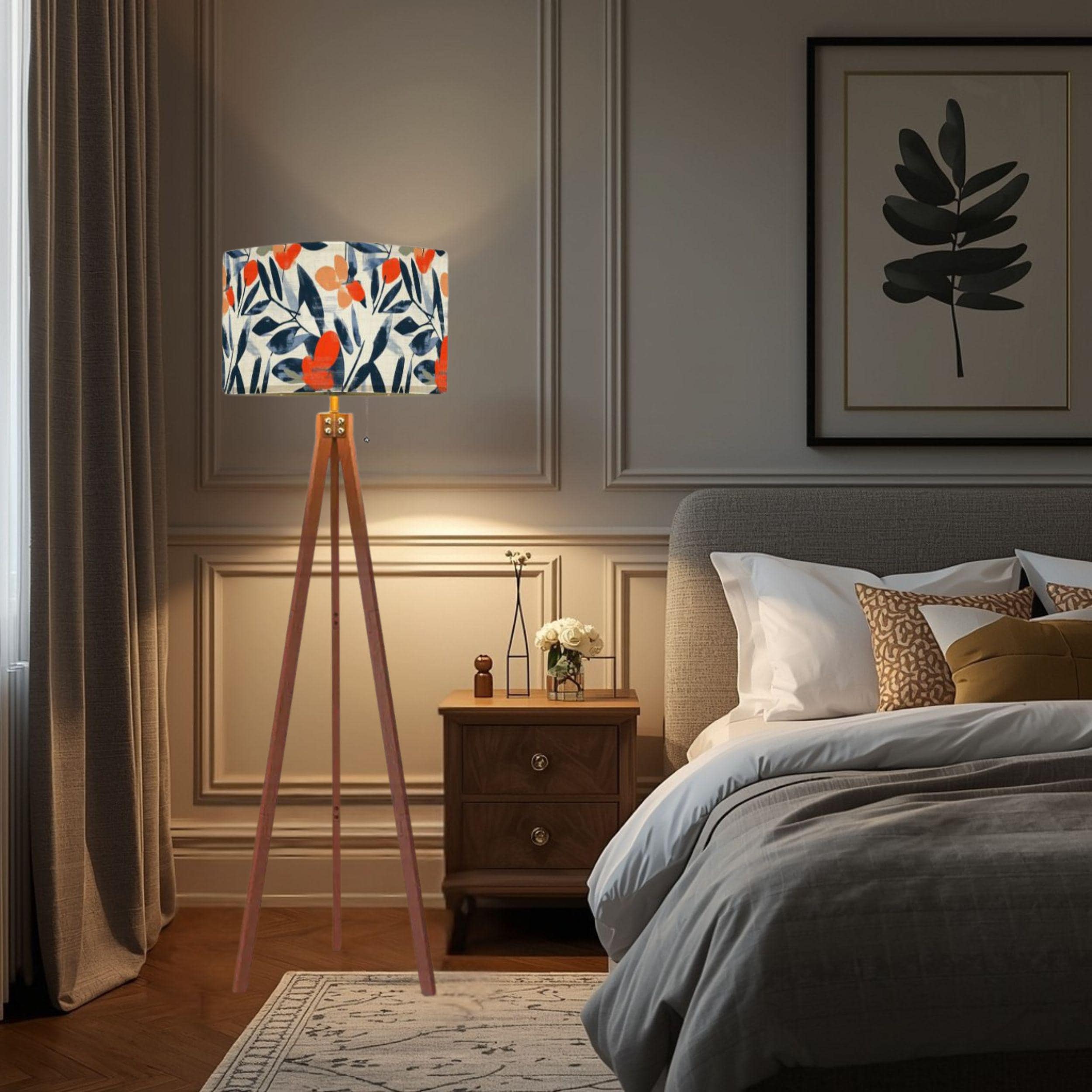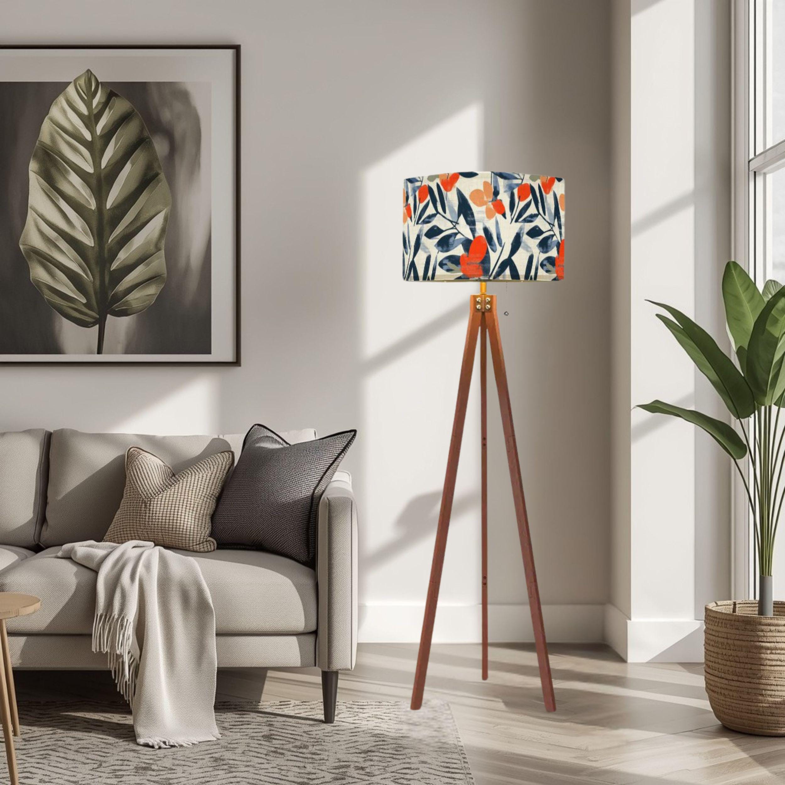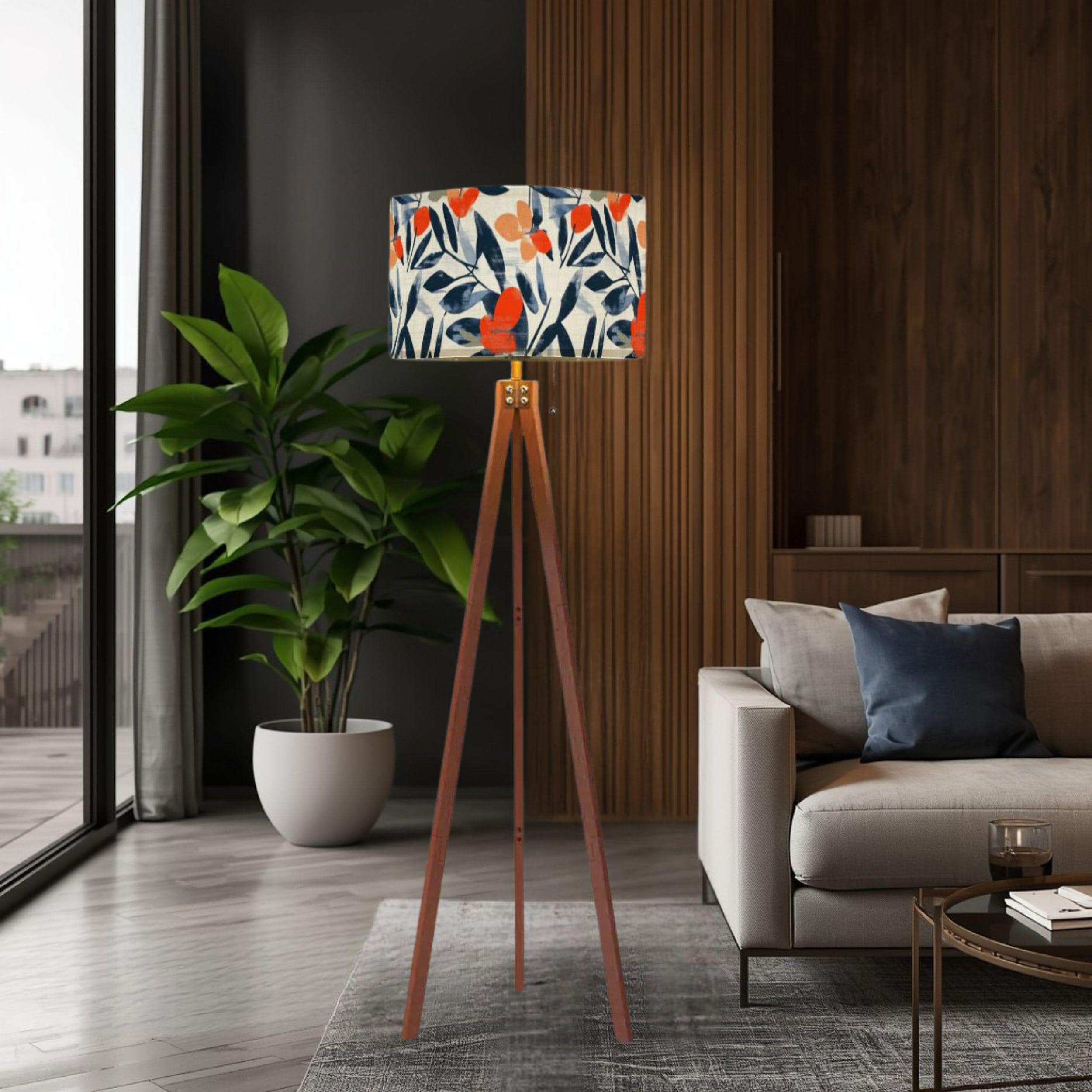 Designed with a single-sided print on a linen-textured shade, this floor lamp offers a warm, inviting glow while serving as a captivating decor accent. Standing at a total height of 59.4 inches, with a lampshade measuring 10.2 inches tall and 17.5 inches in diameter, it provides ample lighting coverage without overwhelming your space. The tripod base adds a modern, sleek touch with its natural wood finish, perfectly complementing the bold botanical design.