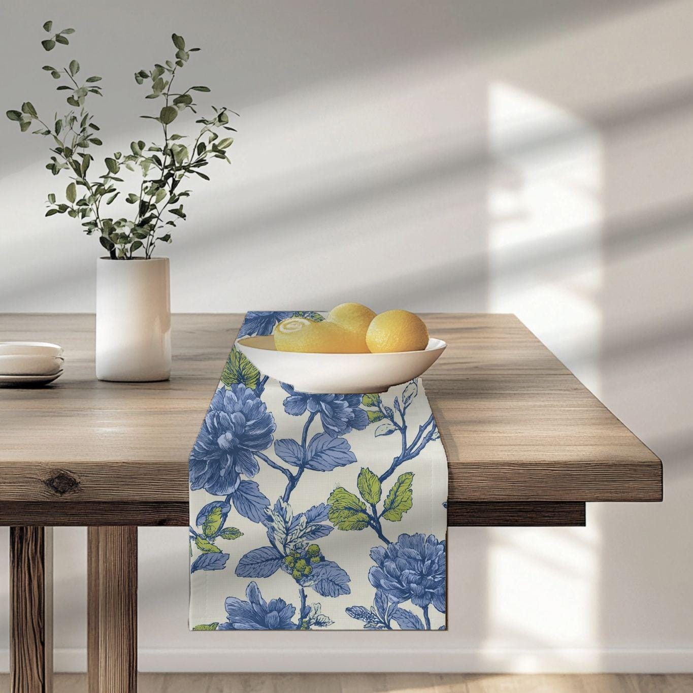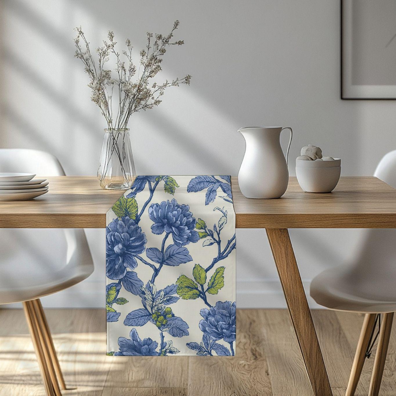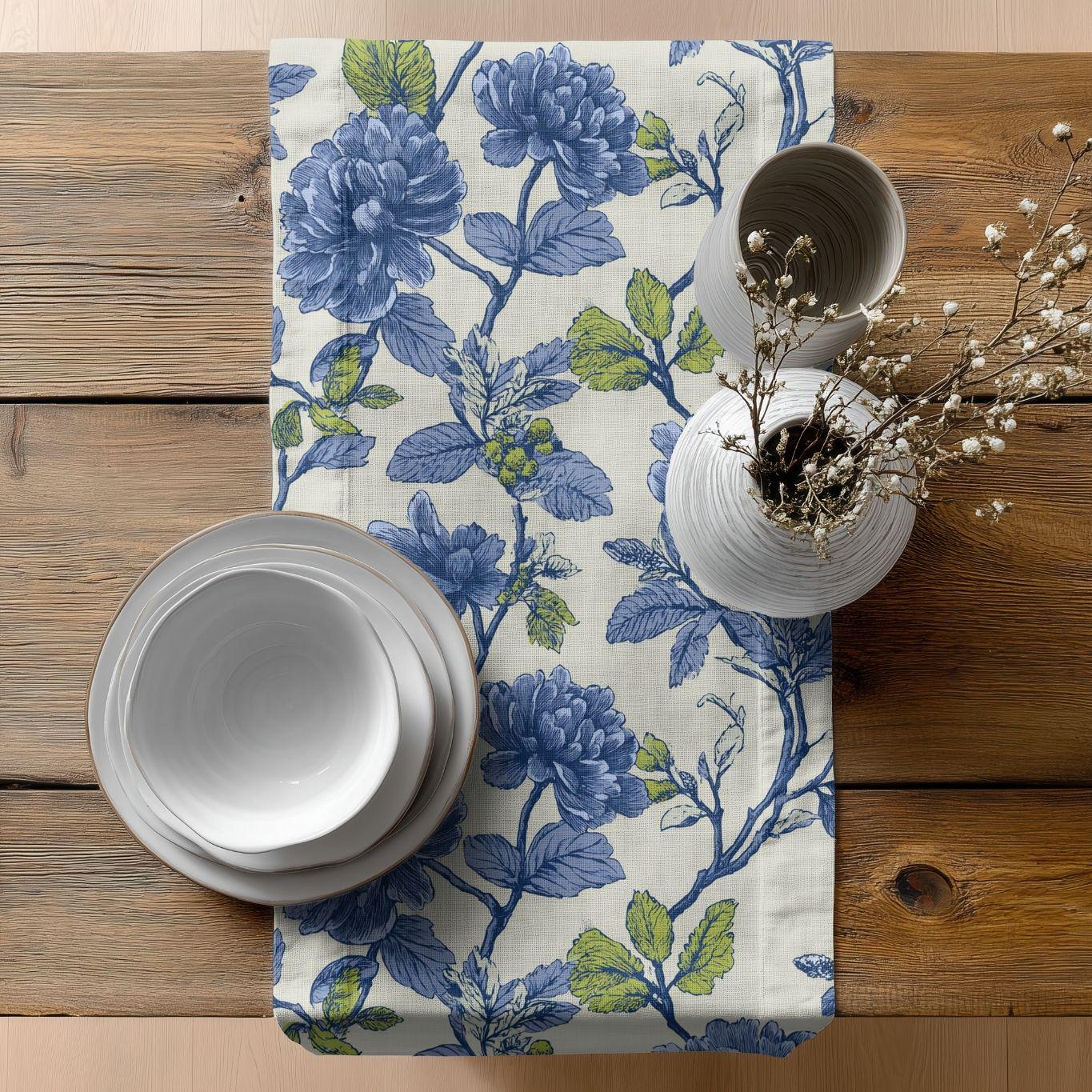 Bring a quiet, vintage garden to your table with this floral table runner. Soft blue blooms and leafy green stems drift across a warm, off-white ground, creating a calm, collected look that complements both relaxed weekend breakfasts and candlelit dinners. The narrow, elongated shape draws the eye down the center of the table, layering beautifully over wood grain or a textured linen cloth. Choose a smooth cotton twill for a muted, classic finish or a vibrant polyester for crisp, saturated color that holds up to frequent use and quick drying. Hemmed edges add a finished, durable touch so the runner stays neat through seasons of gatherings.