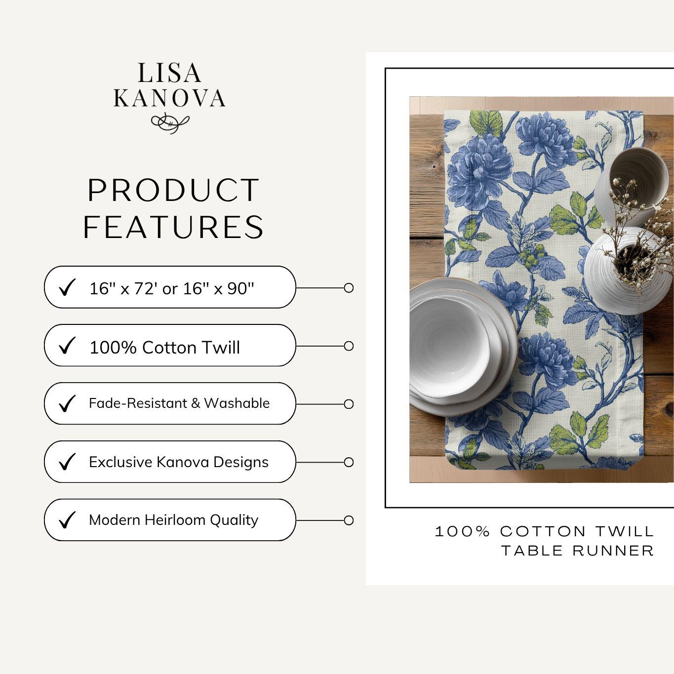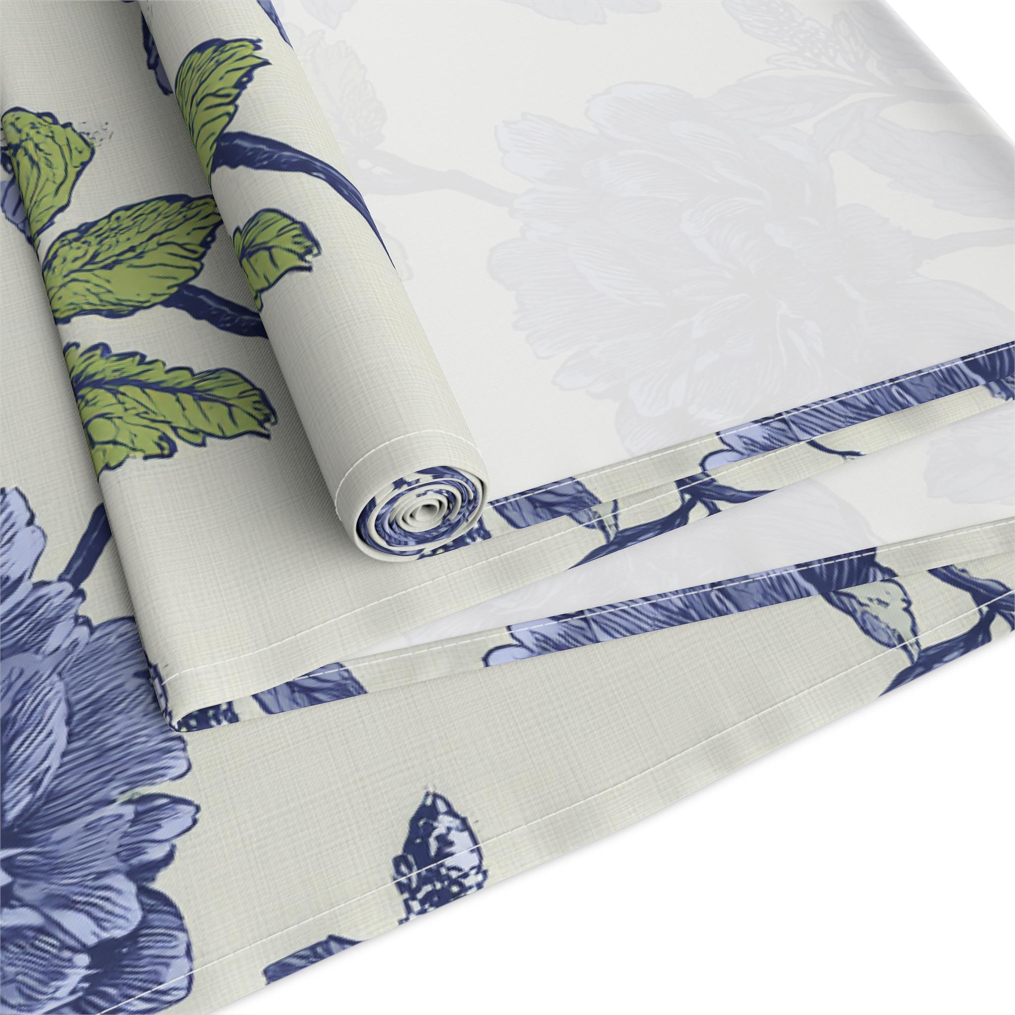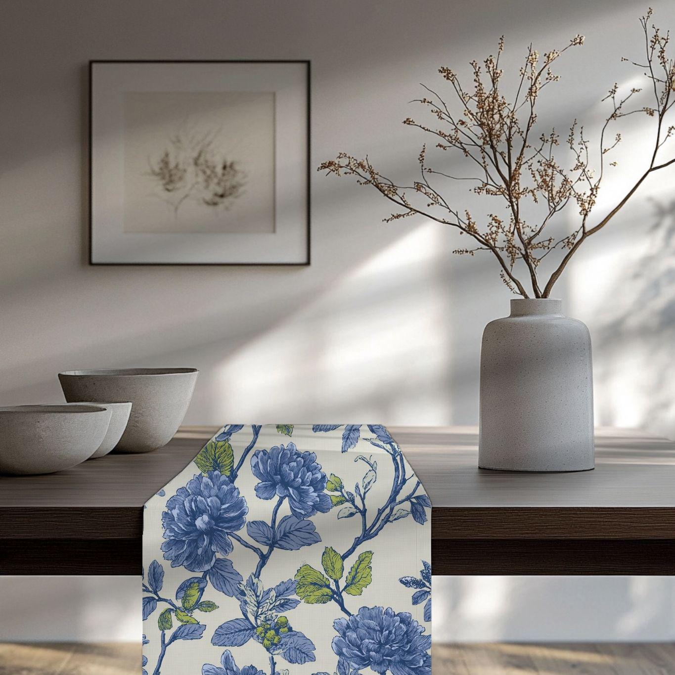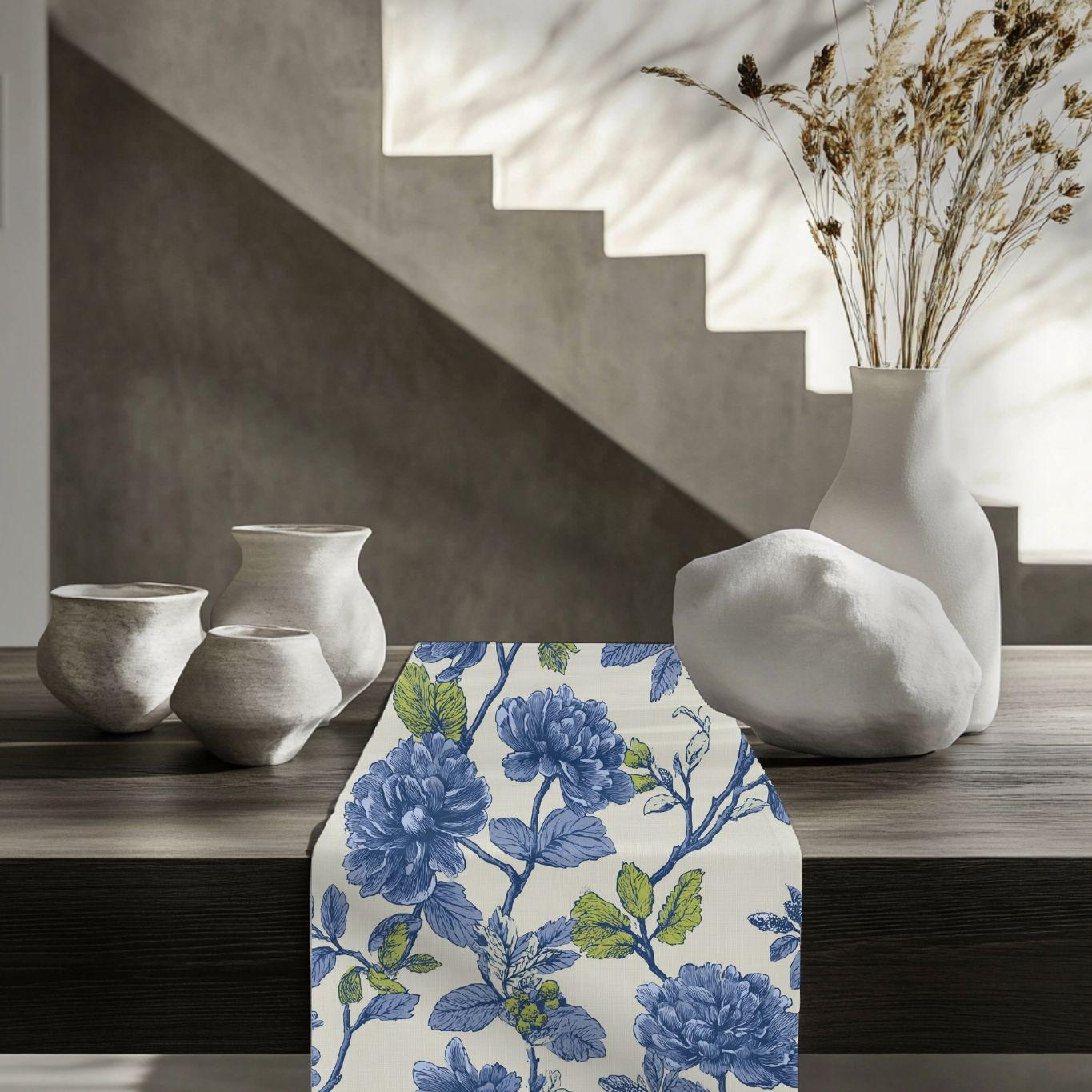 Bring a quiet, vintage garden to your table with this floral table runner. Soft blue blooms and leafy green stems drift across a warm, off-white ground, creating a calm, collected look that complements both relaxed weekend breakfasts and candlelit dinners. The narrow, elongated shape draws the eye down the center of the table, layering beautifully over wood grain or a textured linen cloth. Choose a smooth cotton twill for a muted, classic finish or a vibrant polyester for crisp, saturated color that holds up to frequent use and quick drying. Hemmed edges add a finished, durable touch so the runner stays neat through seasons of gatherings.