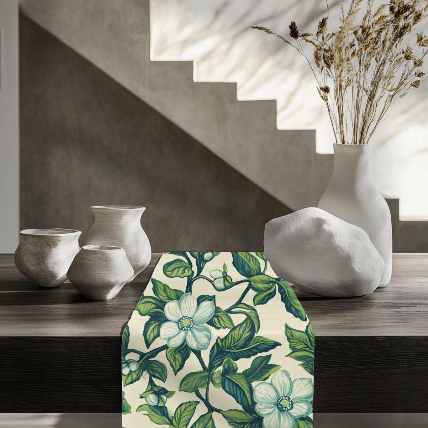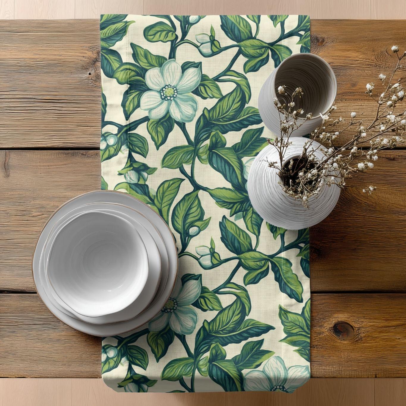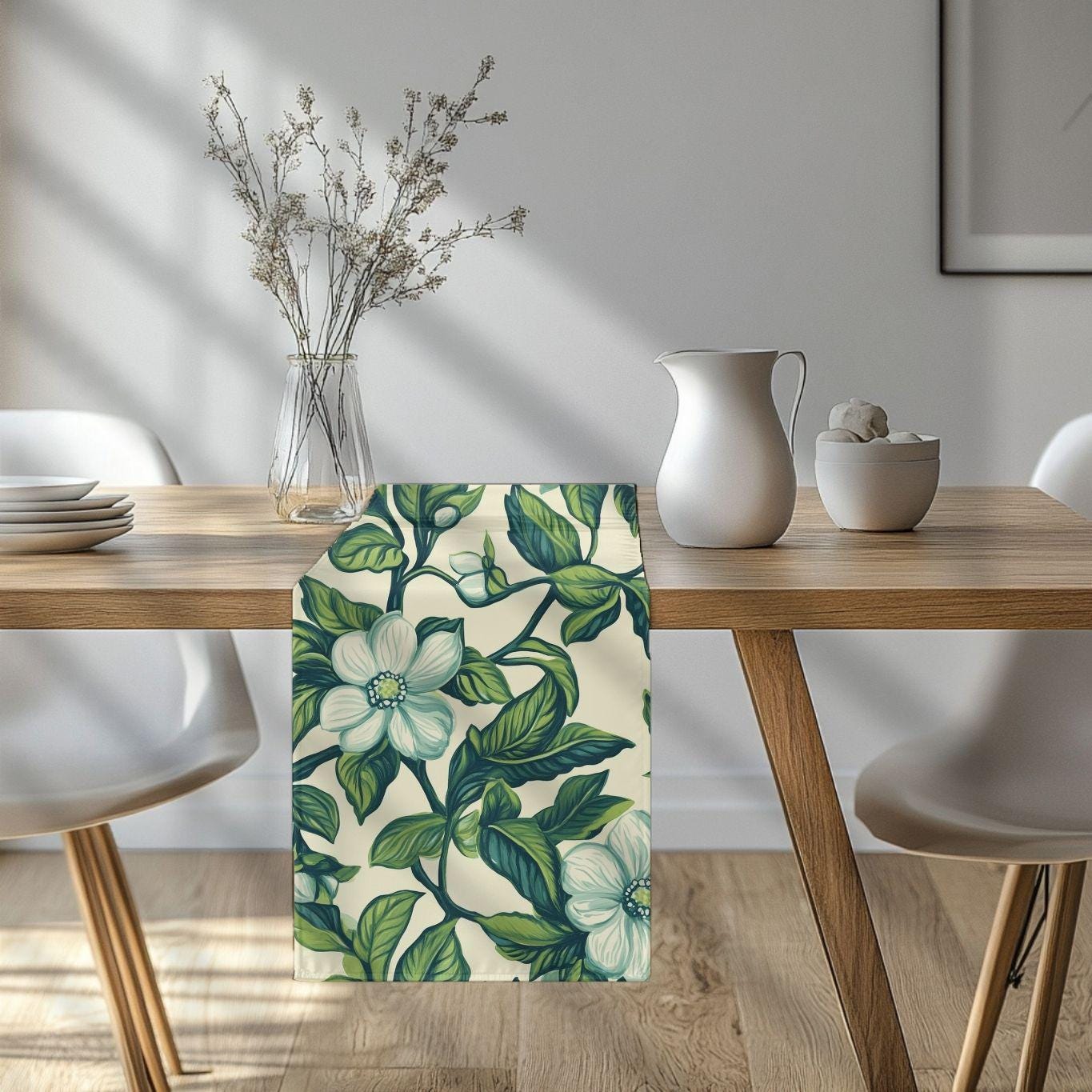 Soft, painterly magnolia vines climb across a creamy background, bringing a calm, vintage botanical feel to your dining table. This table runner blends classic floral illustration with practical materials so it can be used for everyday meals or a relaxed seasonal gathering. Lay it down to anchor a simple centerpiece, tuck it beneath a stack of heirloom plates, or use it as a quiet backdrop for afternoon tea. The muted greens and hand-drawn blooms read like an old botanical print—familiar, gentle, and quietly elegant—so it settles into country kitchens, sunlit breakfast nooks, and slow, intentional dinners with friends.