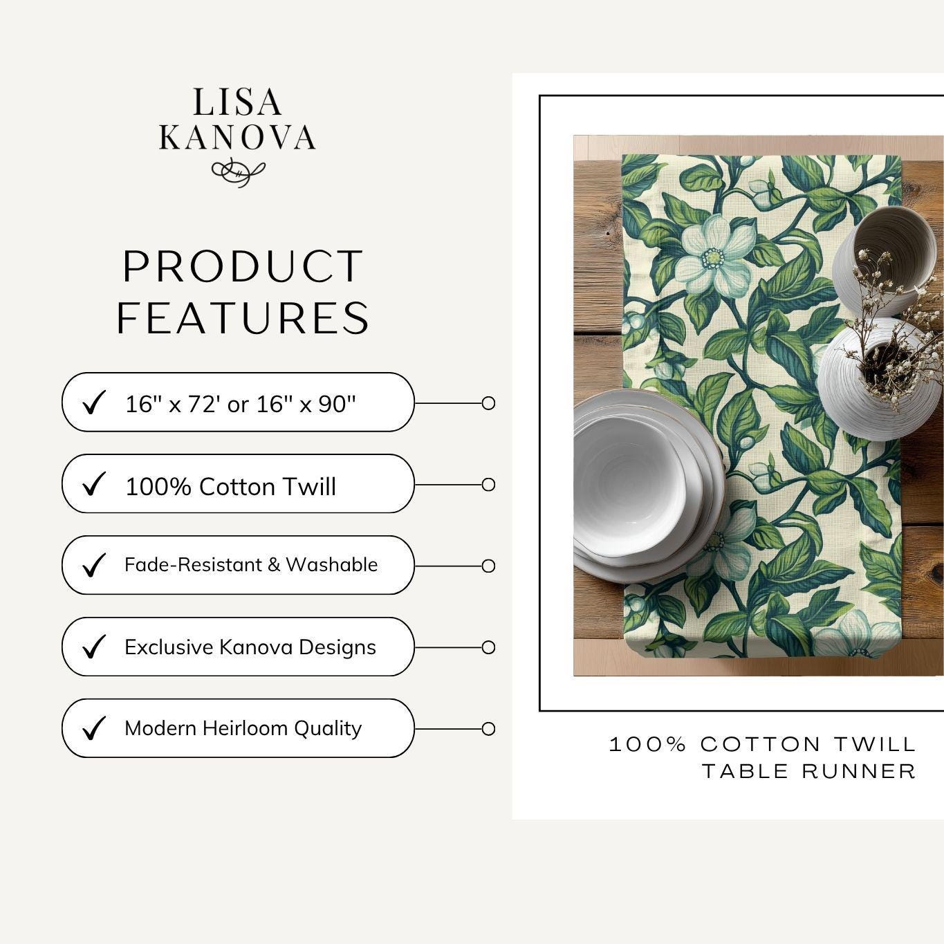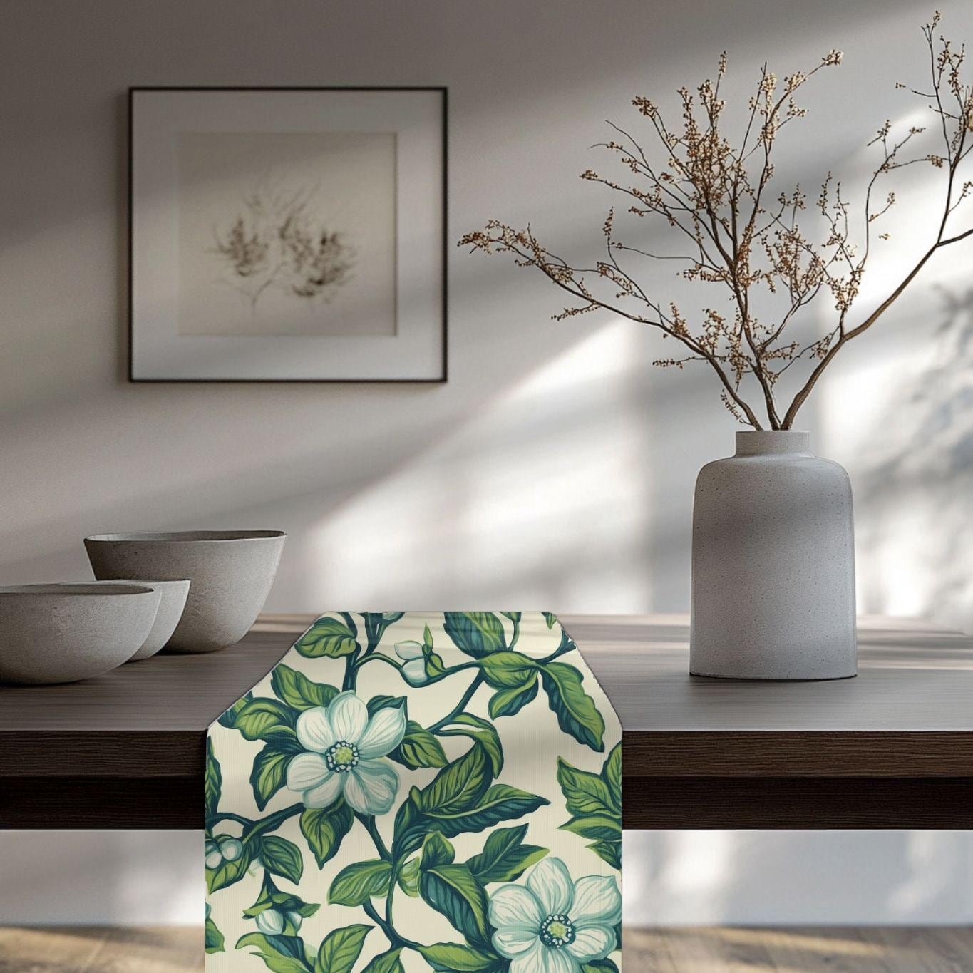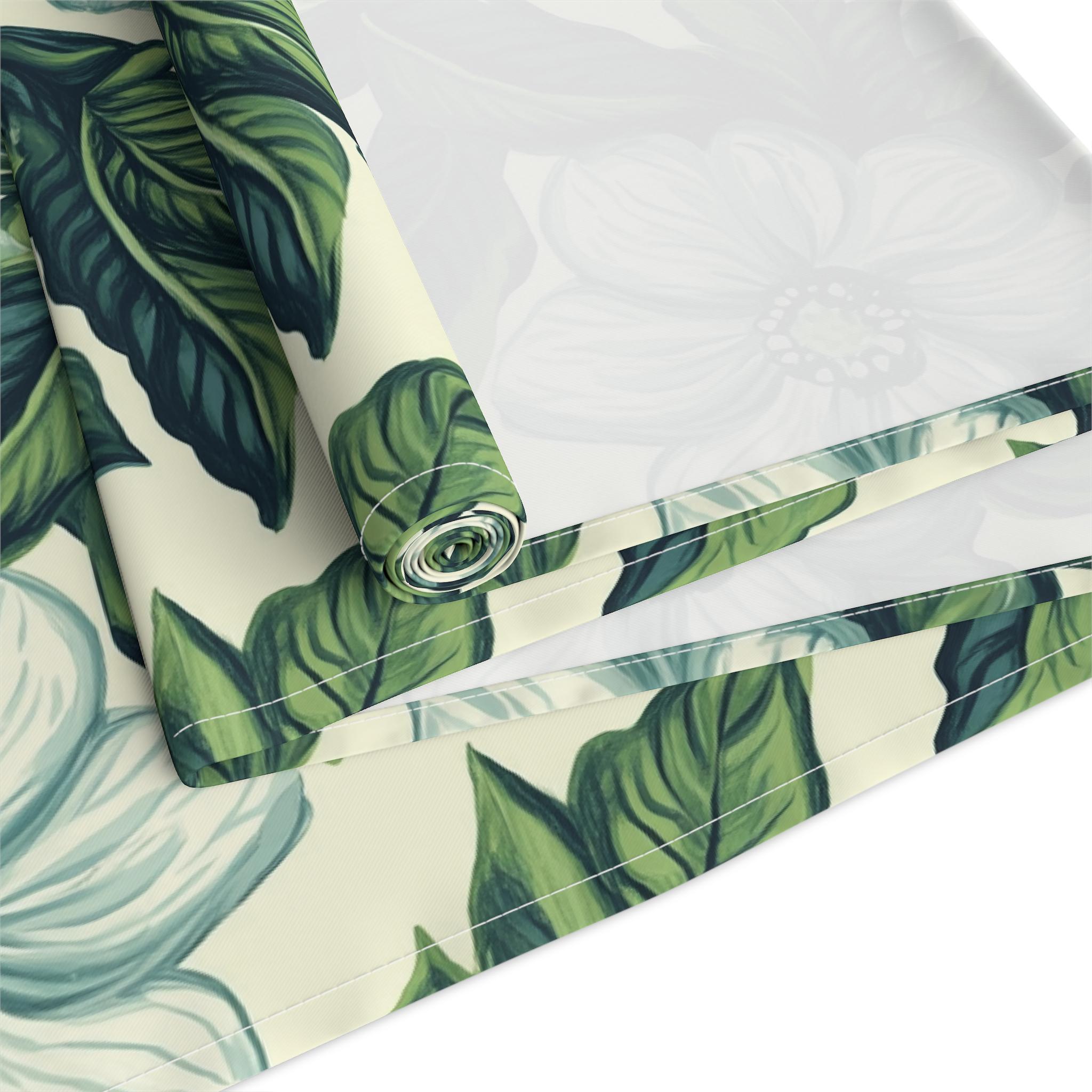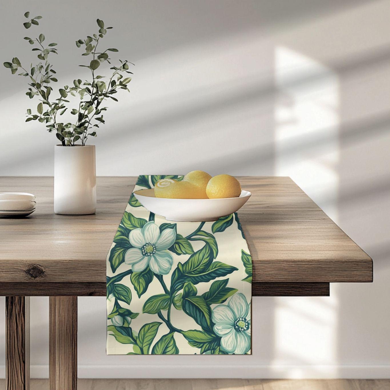 Soft, painterly magnolia vines climb across a creamy background, bringing a calm, vintage botanical feel to your dining table. This table runner blends classic floral illustration with practical materials so it can be used for everyday meals or a relaxed seasonal gathering. Lay it down to anchor a simple centerpiece, tuck it beneath a stack of heirloom plates, or use it as a quiet backdrop for afternoon tea. The muted greens and hand-drawn blooms read like an old botanical print—familiar, gentle, and quietly elegant—so it settles into country kitchens, sunlit breakfast nooks, and slow, intentional dinners with friends.