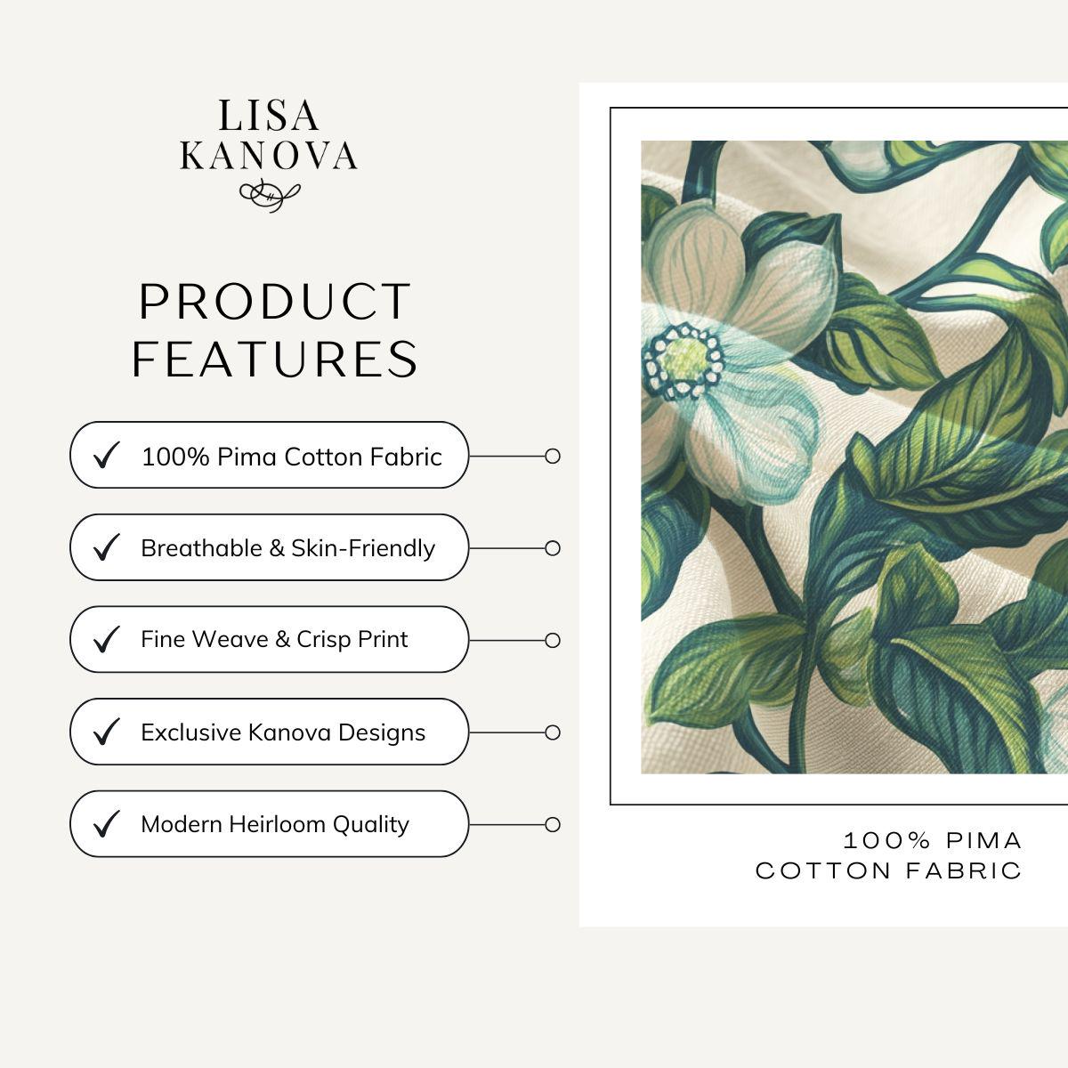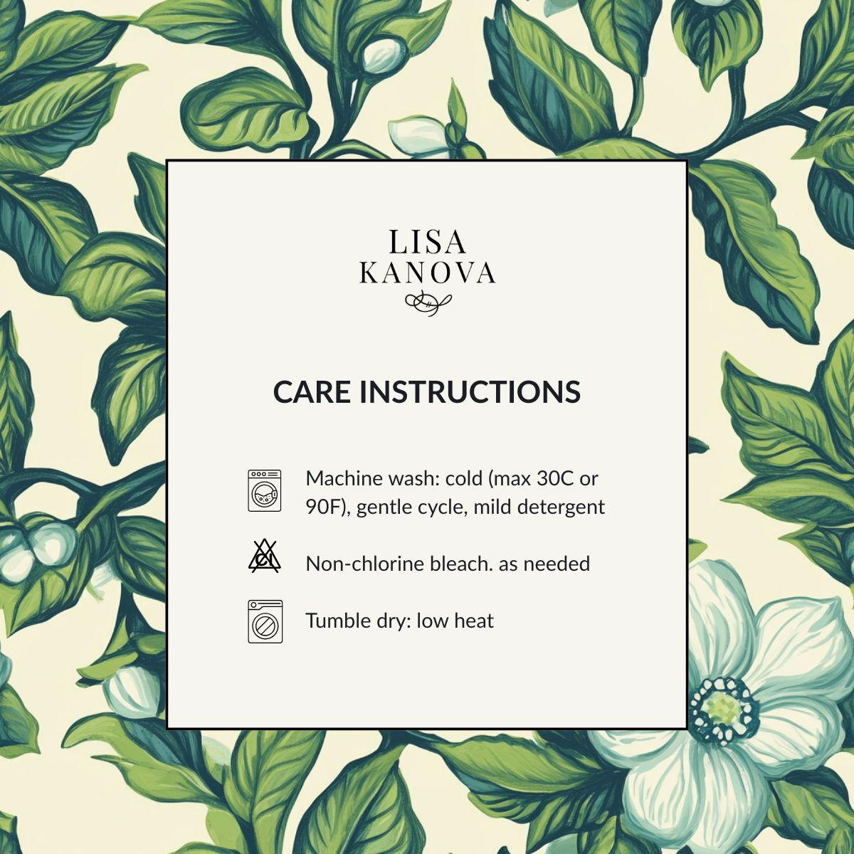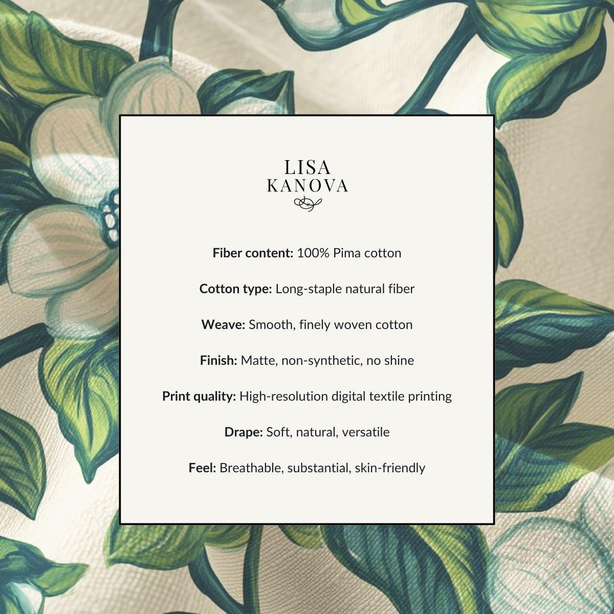 Soft, breathable, and quietly elegant—this pima cotton piece brings botanical calm into everyday wear. The design shows hand-drawn white blooms and lush green leaves on a warm, creamy background, creating a vintage-meets-modern feel. Wear it on slow mornings with a mug of tea, layer it for a walk through neighborhood gardens, or fold it into a travel bag for a cottage weekend. The fabric feels luxurious against the skin, drapes gently, and keeps its color and shape through repeated wear. For those who favor thoughtful, nature-inspired style, this item reads like a small, personal statement: subtle, refined, and steady.
