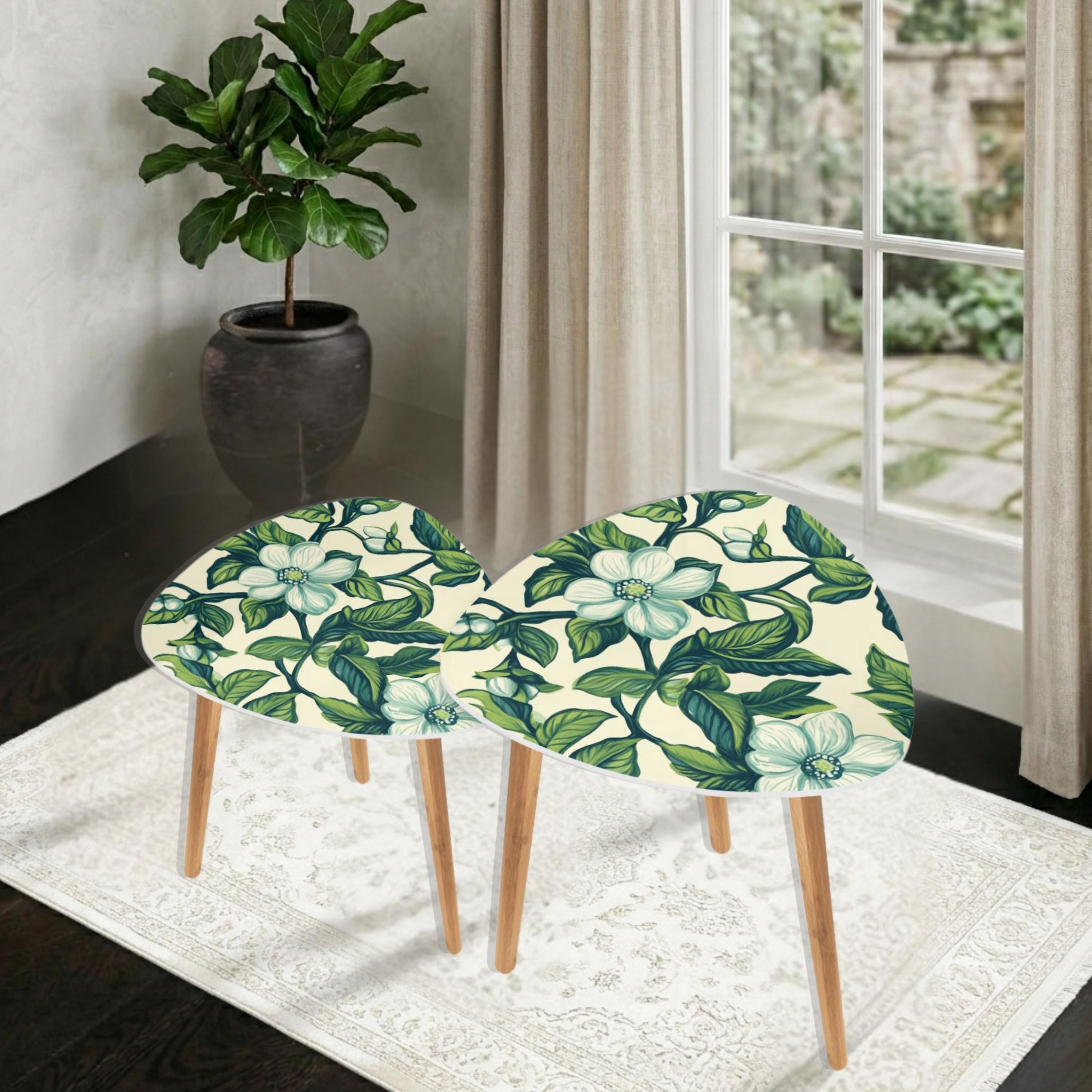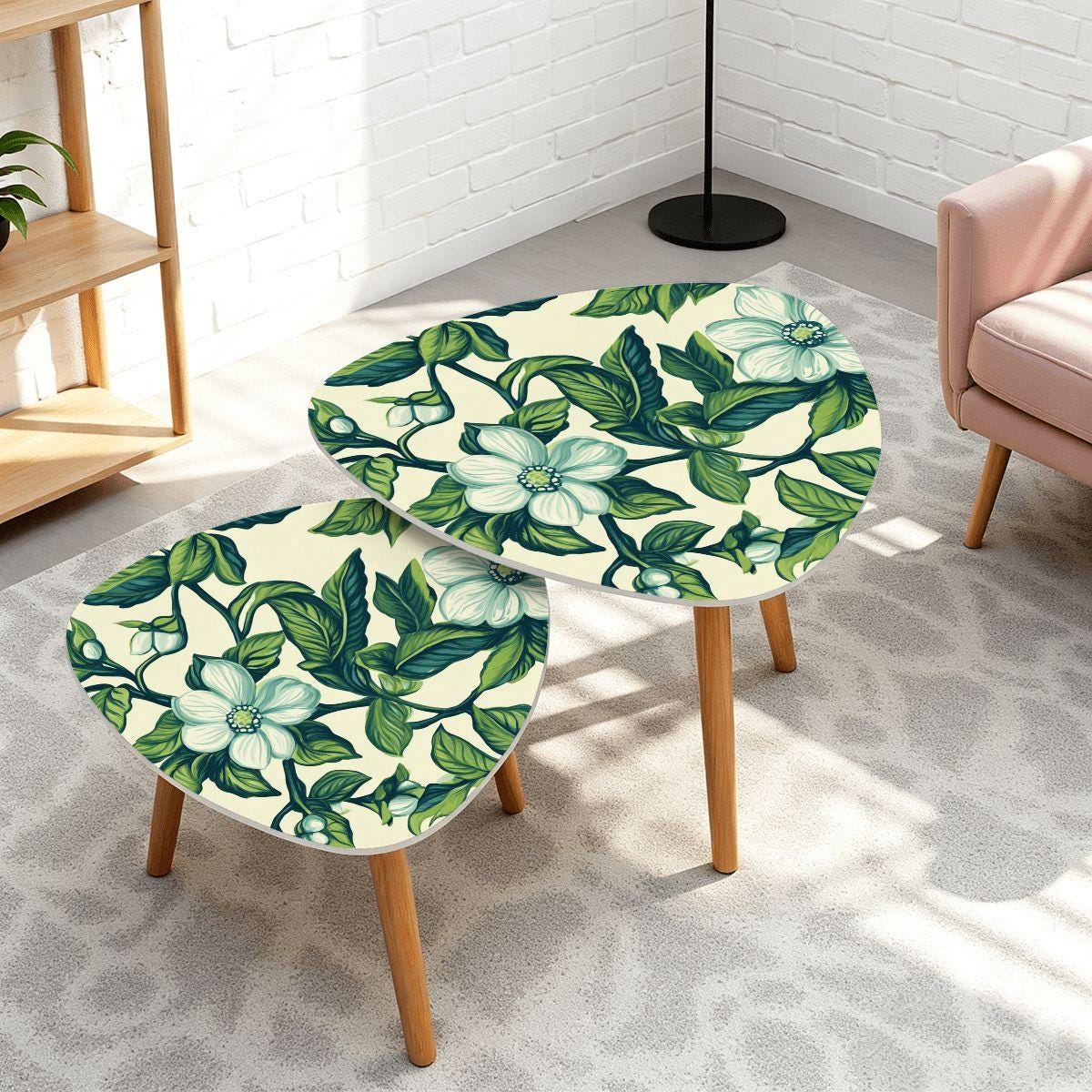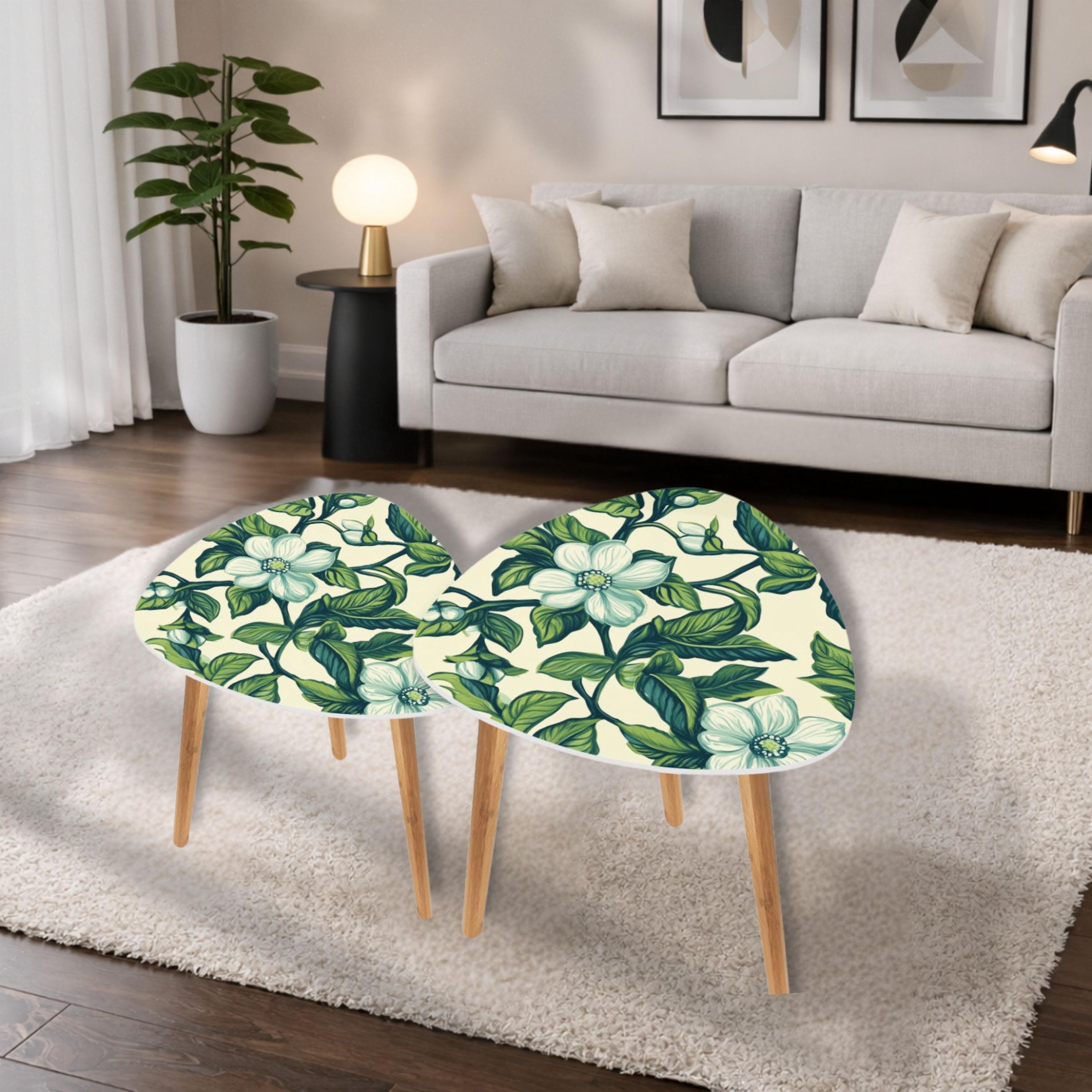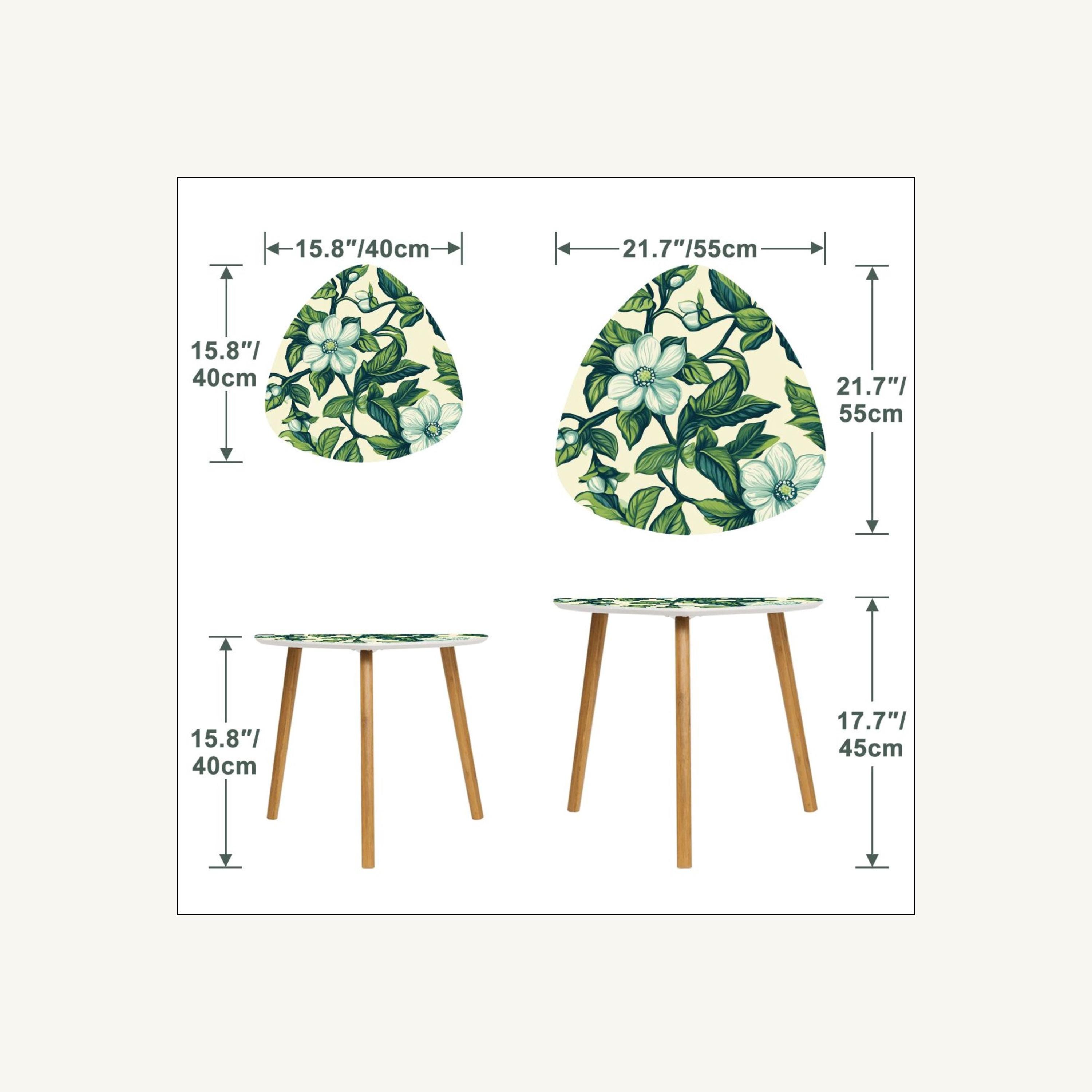 Designed with versatility in mind, these tables feature a beautiful single-sided print of lush garden foliage, beautifully rendered through UV printing for vibrant, lasting color. The set includes two tables of different sizes—larger measuring 21.7''x21.7''x17.7'' and smaller at 15.8''x15.8''x15.8''—making them ideal for layered setups or flexible arrangement options.