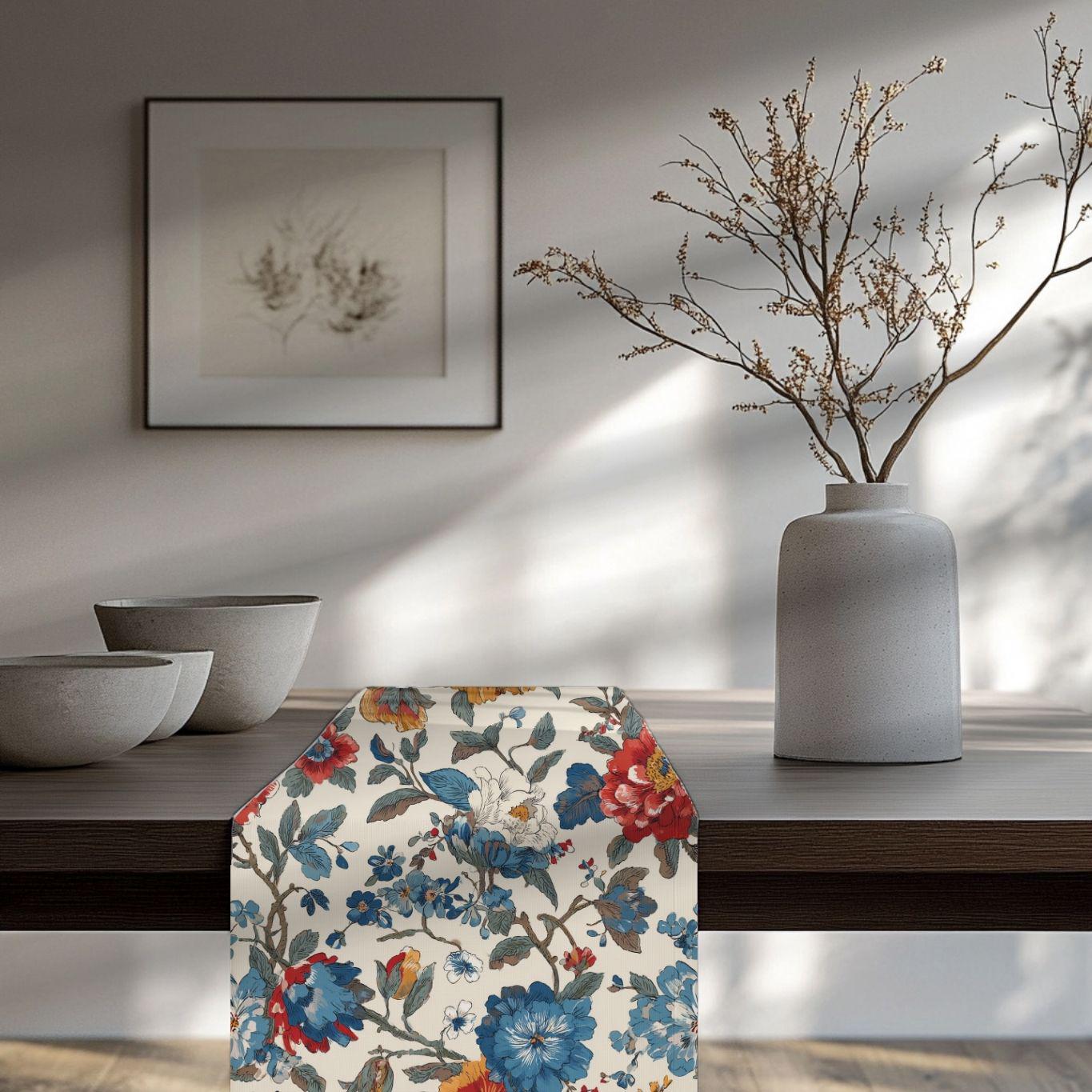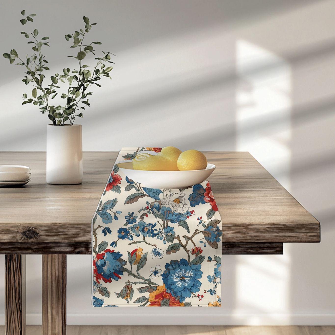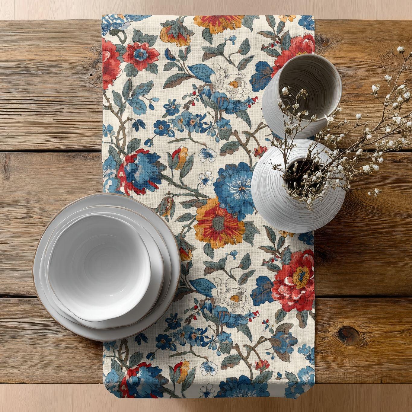 Soft, painterly florals stretch along a long, elegant runner to bring warm, lived-in charm to your table. The muted cream background and faded blue and rust blossoms look like heirloom fabric found at a countryside market — familiar, calm, and quietly beautiful. Lay it under candles, mismatched plates, or a simple vase; it tucks into cozy Sunday breakfasts and slow, intimate dinners with equal ease. The two fabric options let you choose sharper, vibrant color or a more classic, softened look that integrates seamlessly with vintage or modern farmhouse settings.