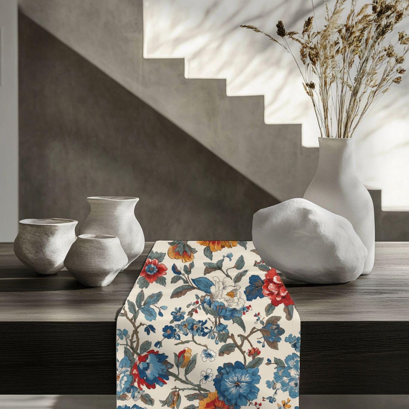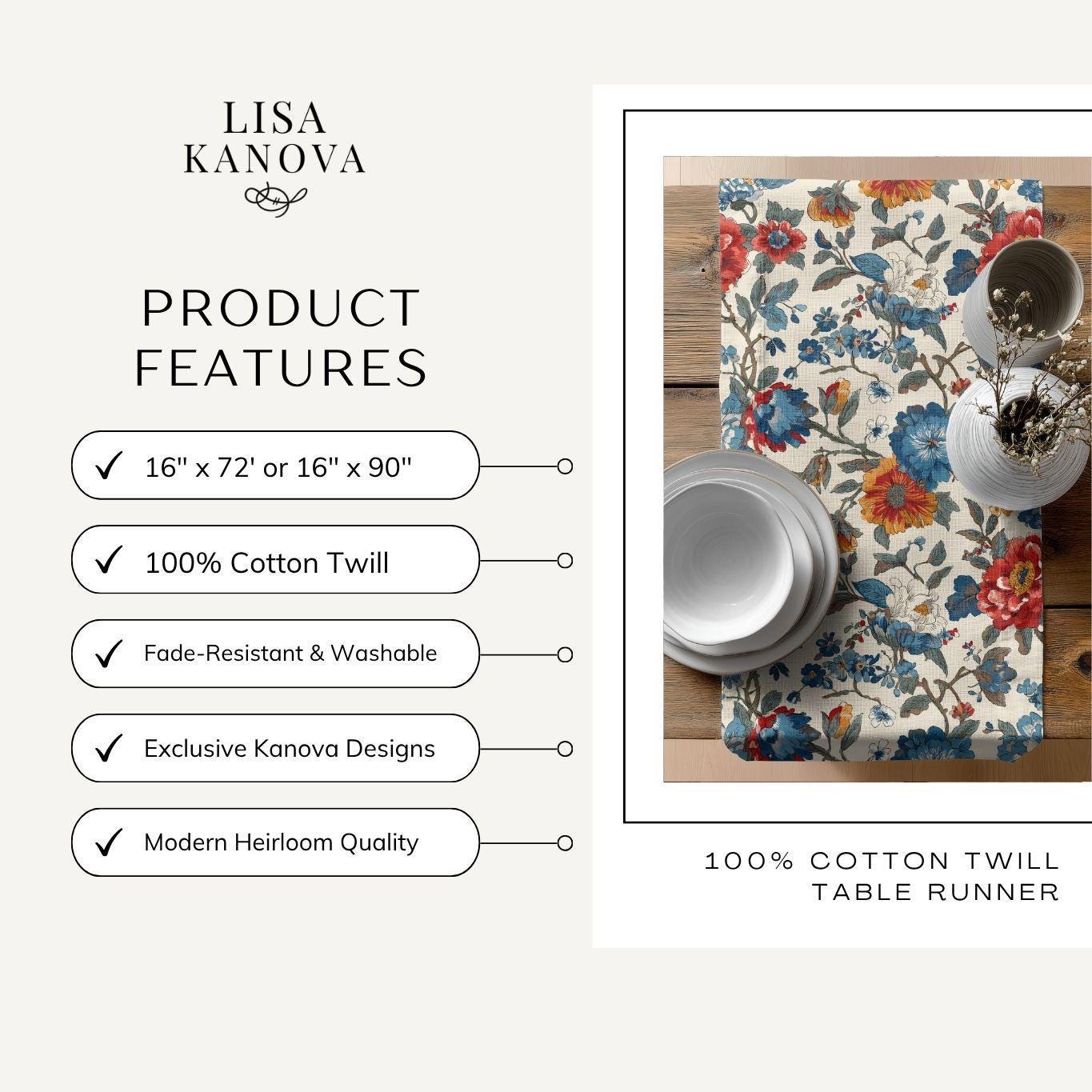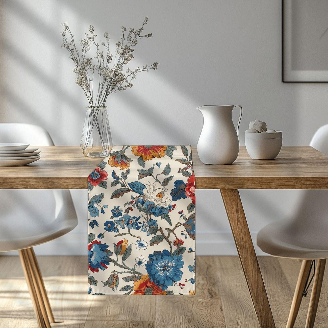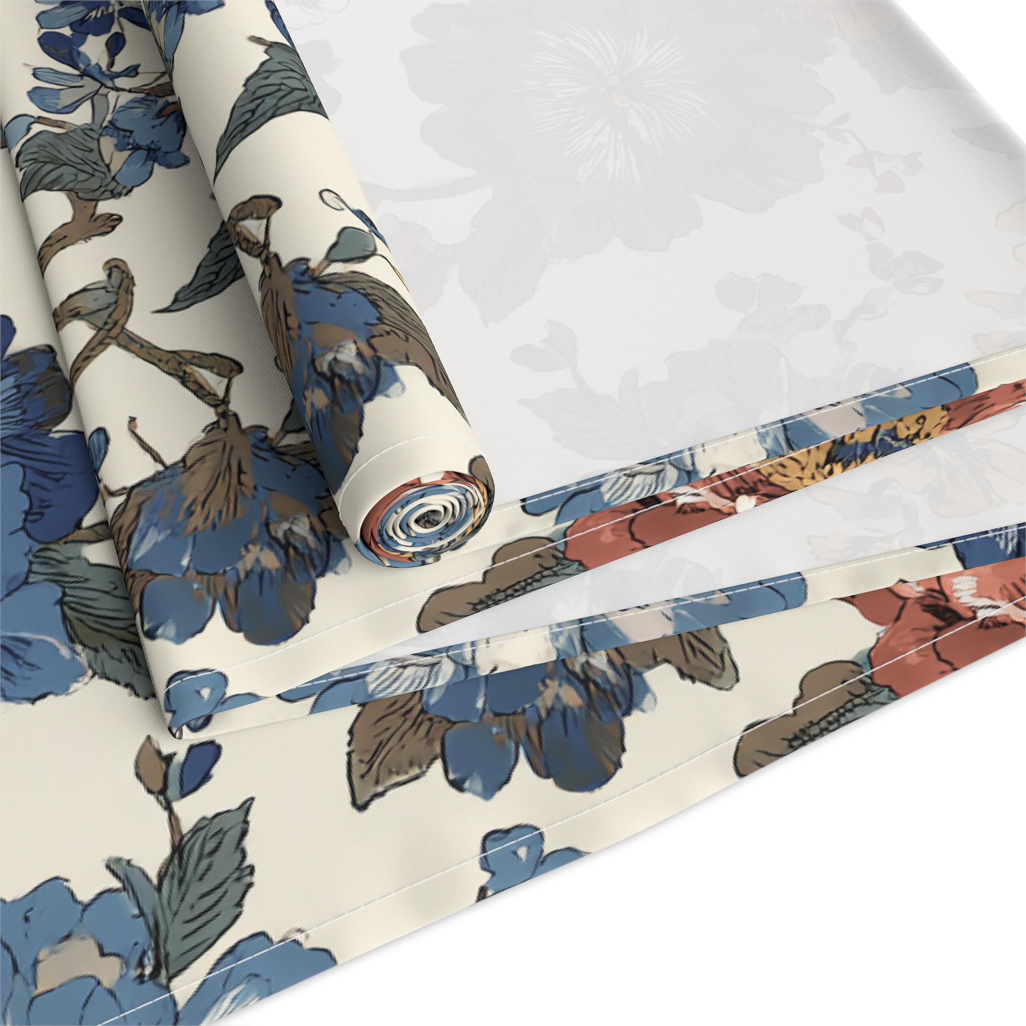 Soft, painterly florals stretch along a long, elegant runner to bring warm, lived-in charm to your table. The muted cream background and faded blue and rust blossoms look like heirloom fabric found at a countryside market — familiar, calm, and quietly beautiful. Lay it under candles, mismatched plates, or a simple vase; it tucks into cozy Sunday breakfasts and slow, intimate dinners with equal ease. The two fabric options let you choose sharper, vibrant color or a more classic, softened look that integrates seamlessly with vintage or modern farmhouse settings.
