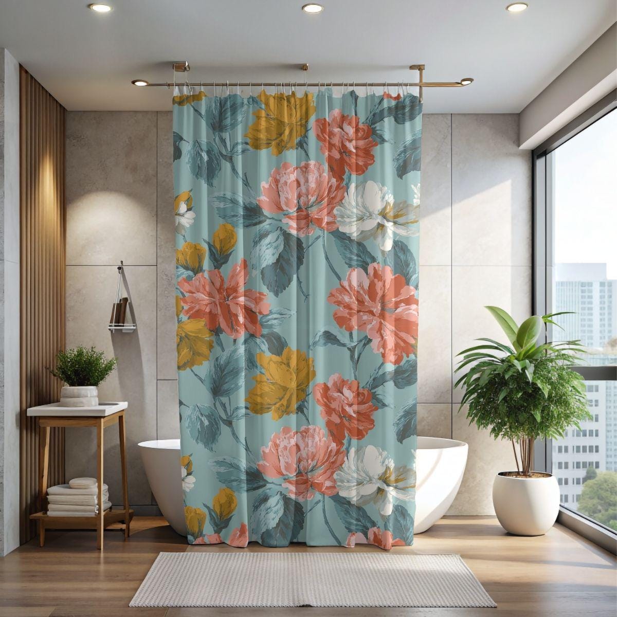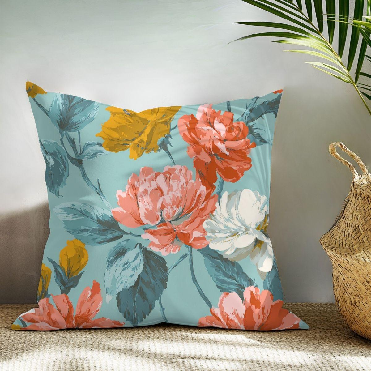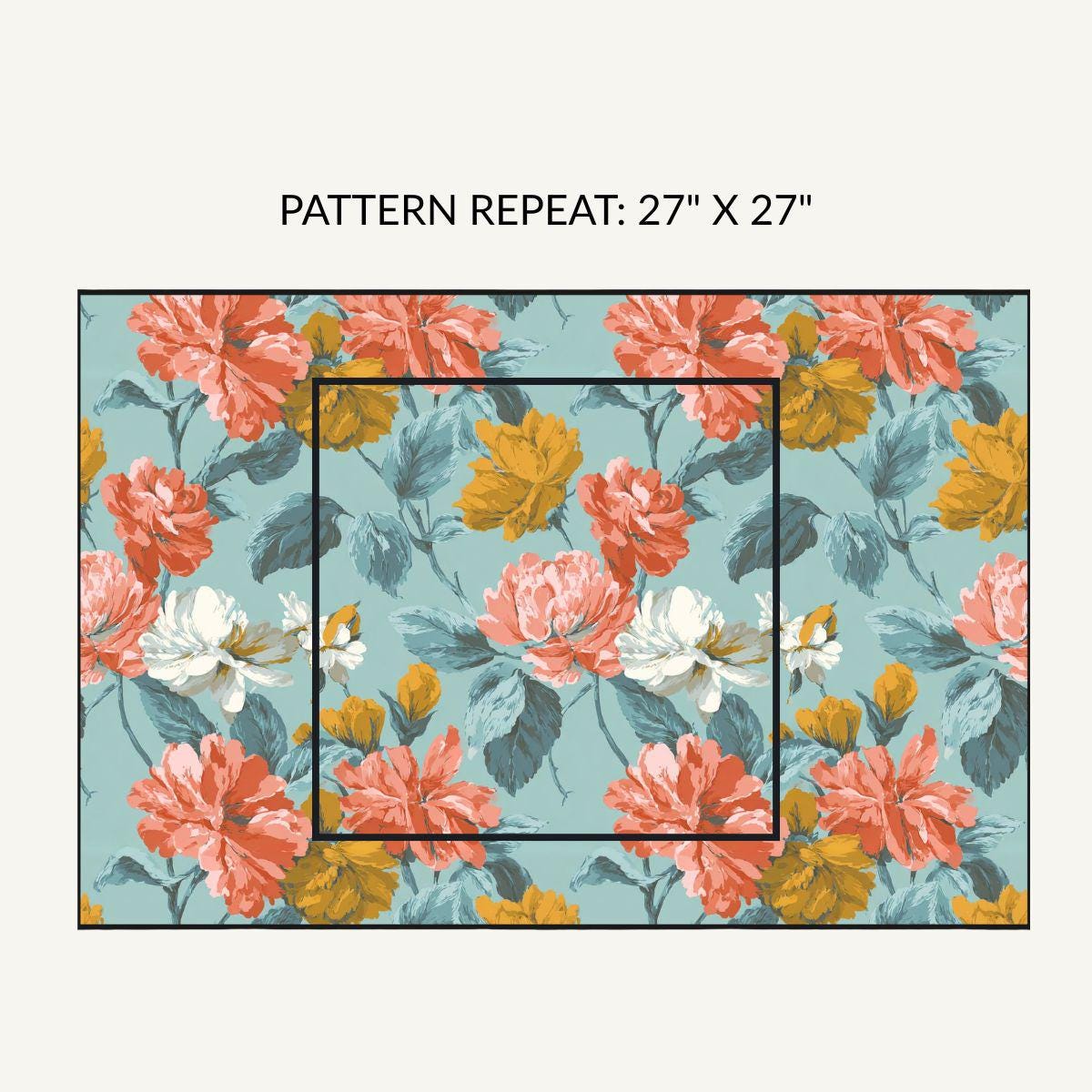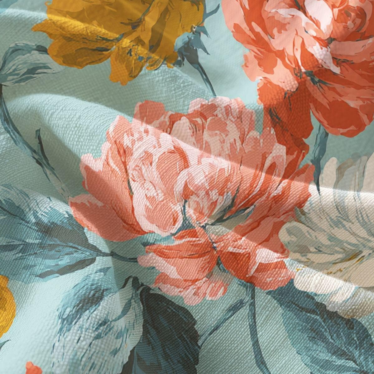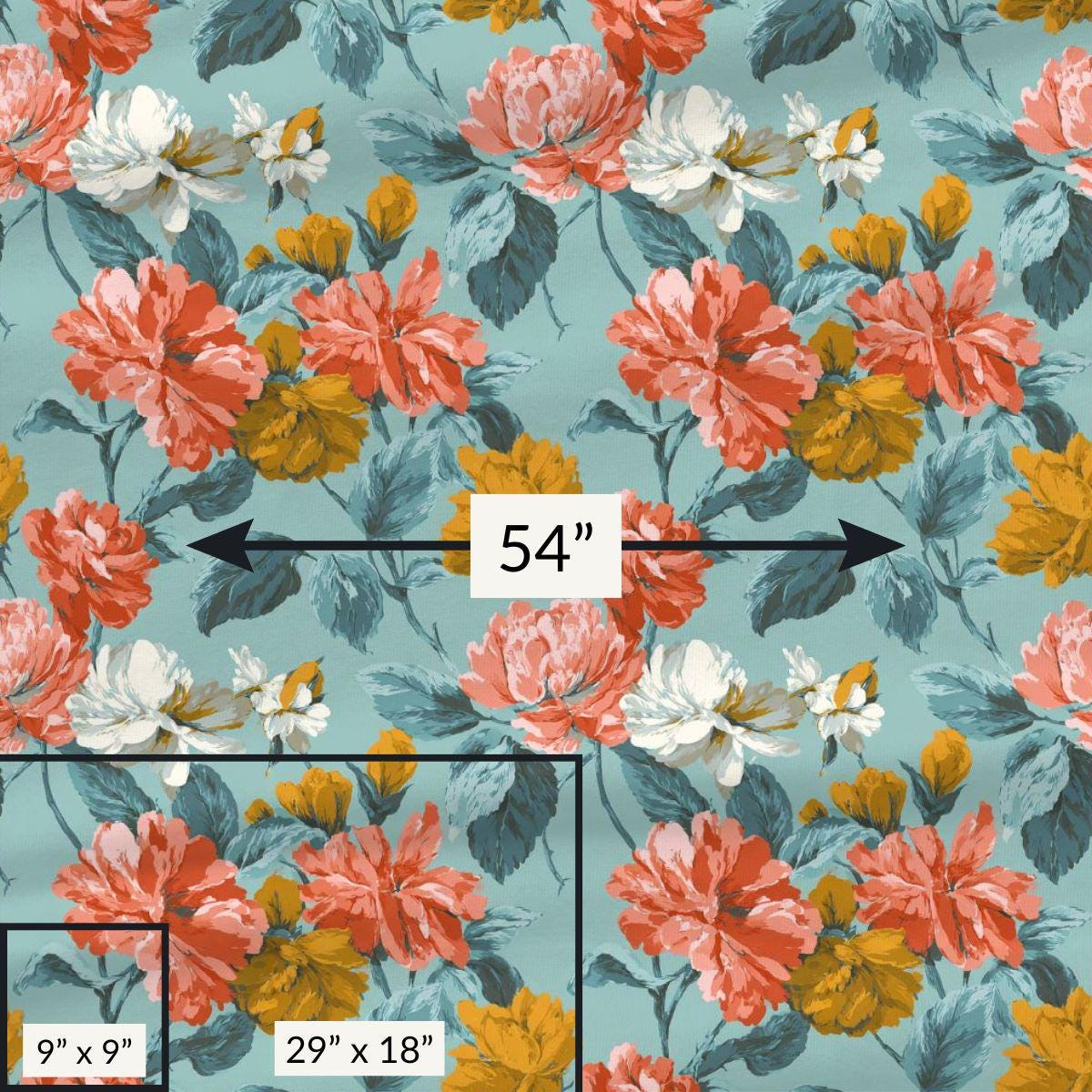 - Painterly vintage floral print in coral, mustard, cream on teal