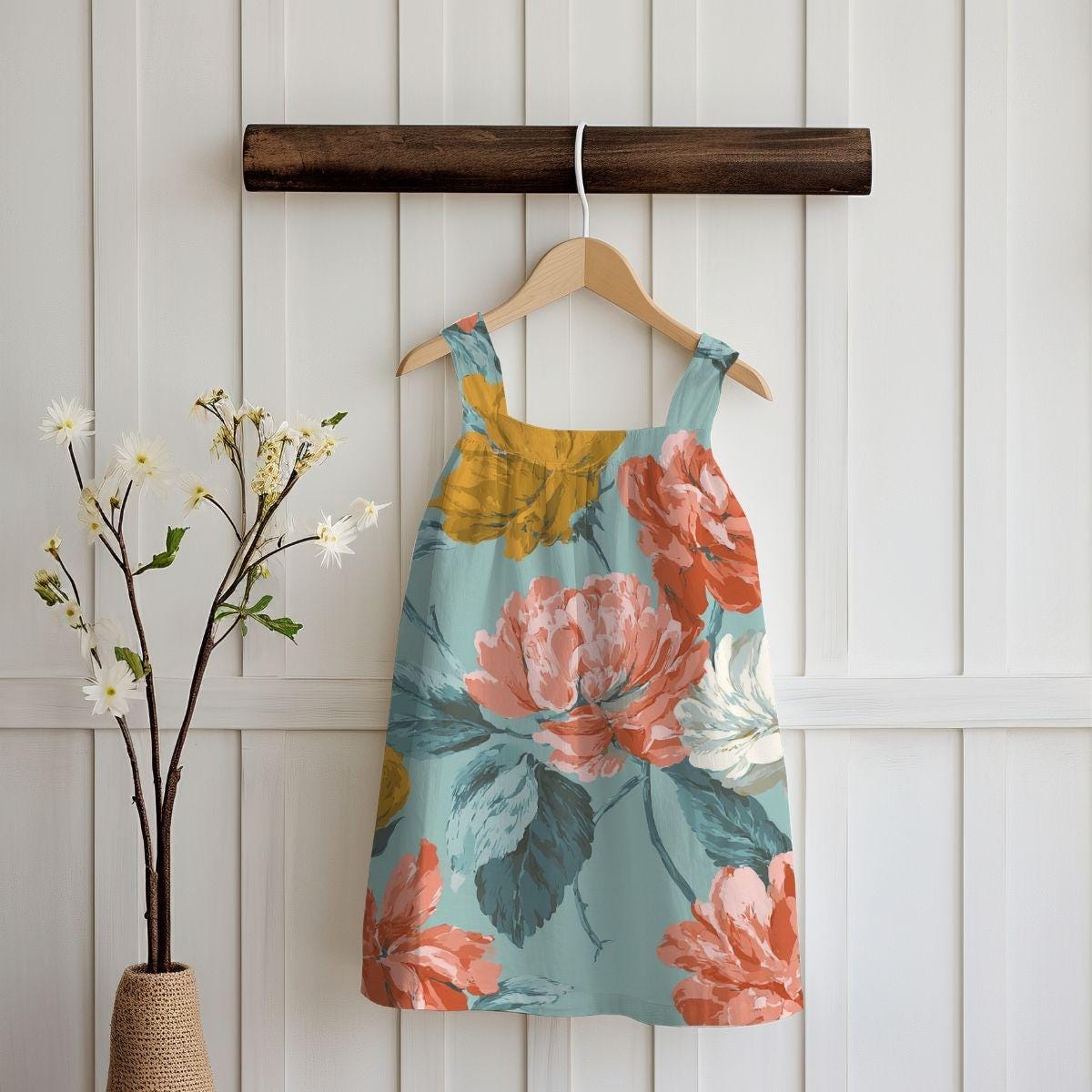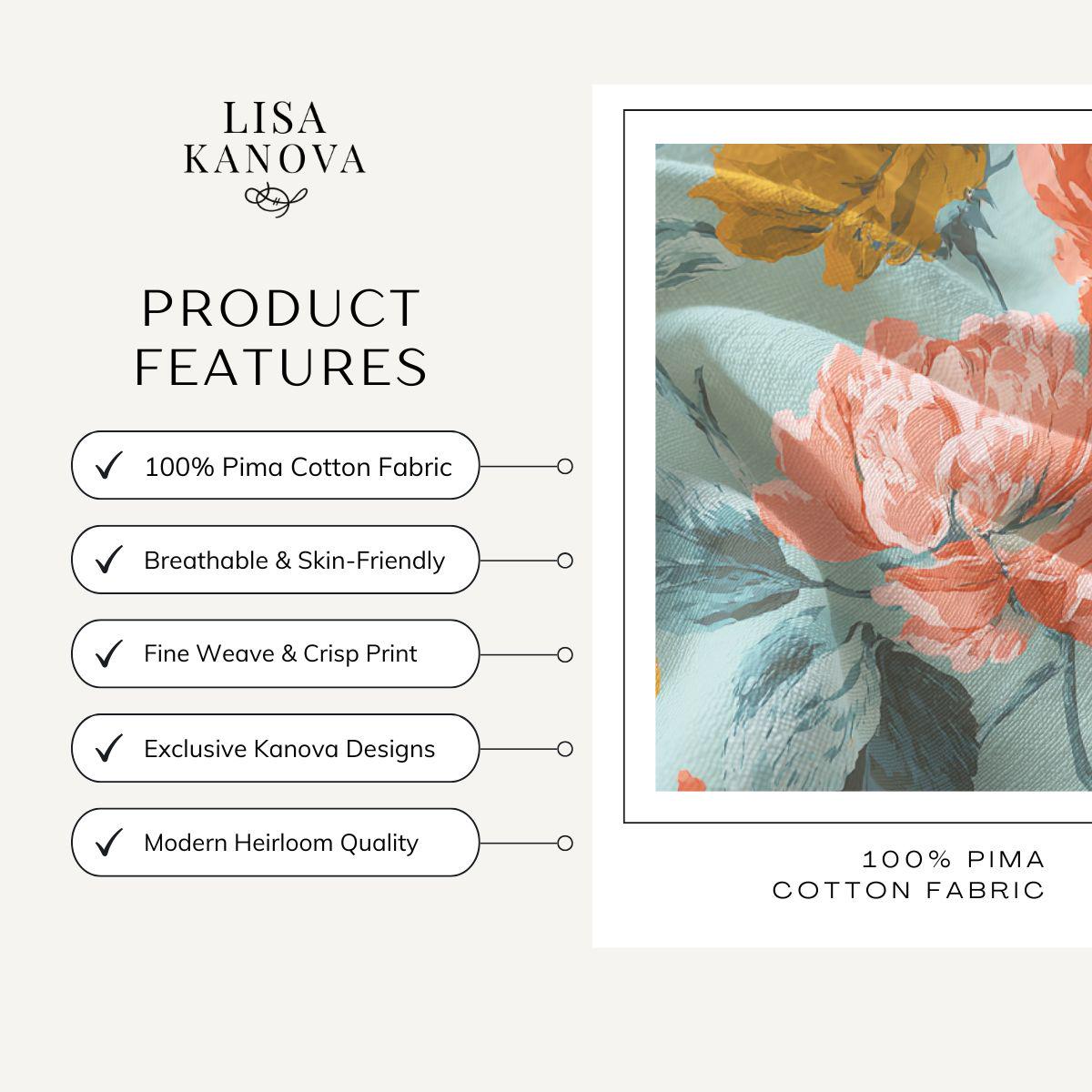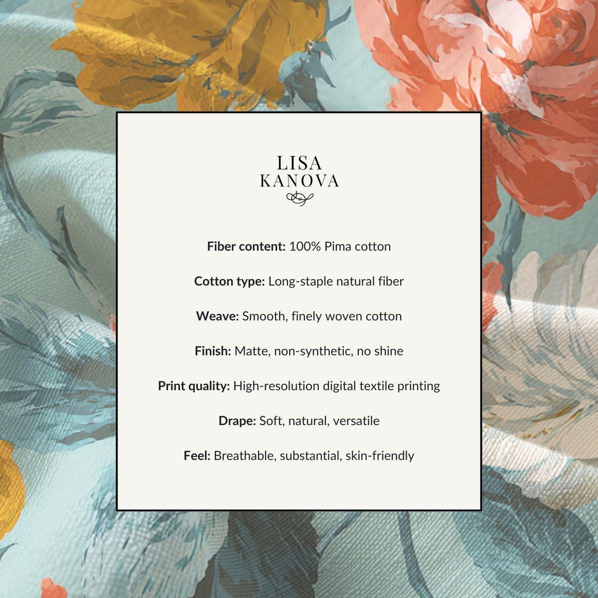 Light, breathy, and quietly elegant—this piece brings the softness of combed Pima cotton together with a vintage floral print in warm coral, mustard, and cream against a muted teal background. It sits close to the skin and drapes with a gentle flow, inviting slow mornings, garden visits, and cups of tea on the porch. The design reads like a painted canvas: layered petals, painterly brushstrokes, and leaves that trail across the fabric. Wear it where comfort matters and beauty feels personal—long walks, cozy gatherings, or the days you want to feel a little more cultivated without trying too hard.