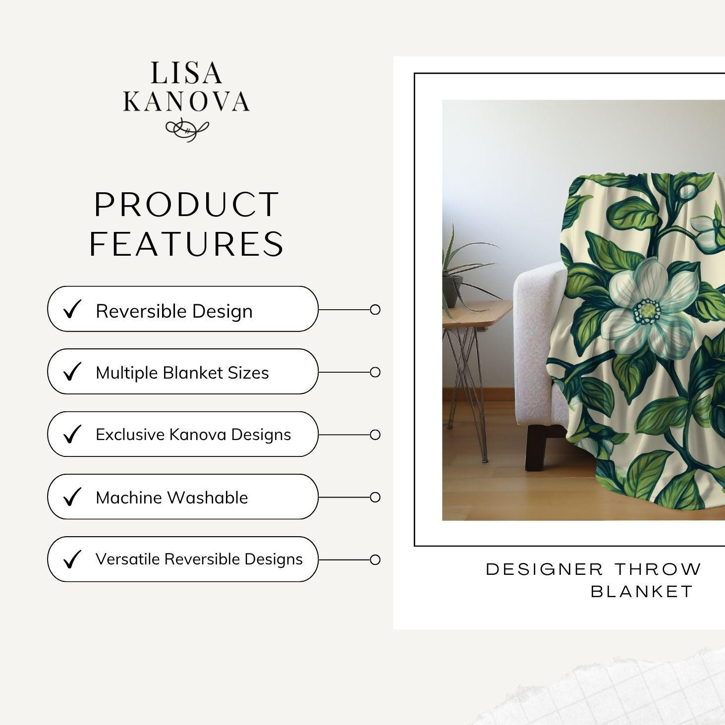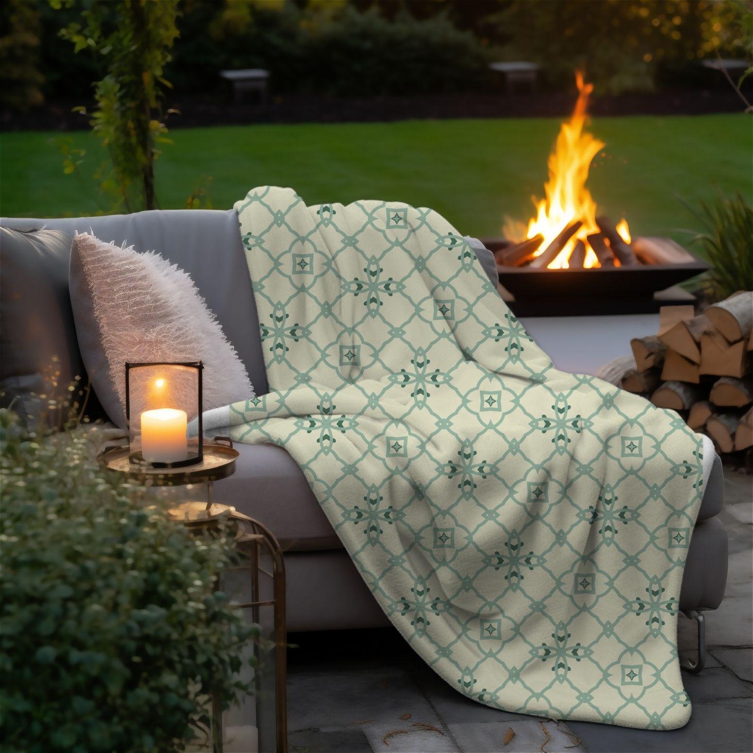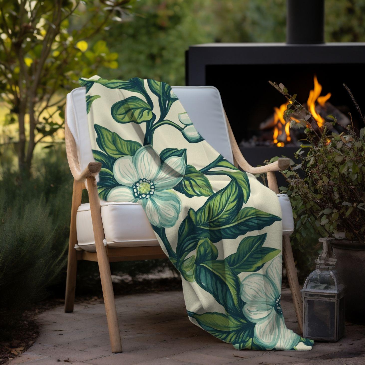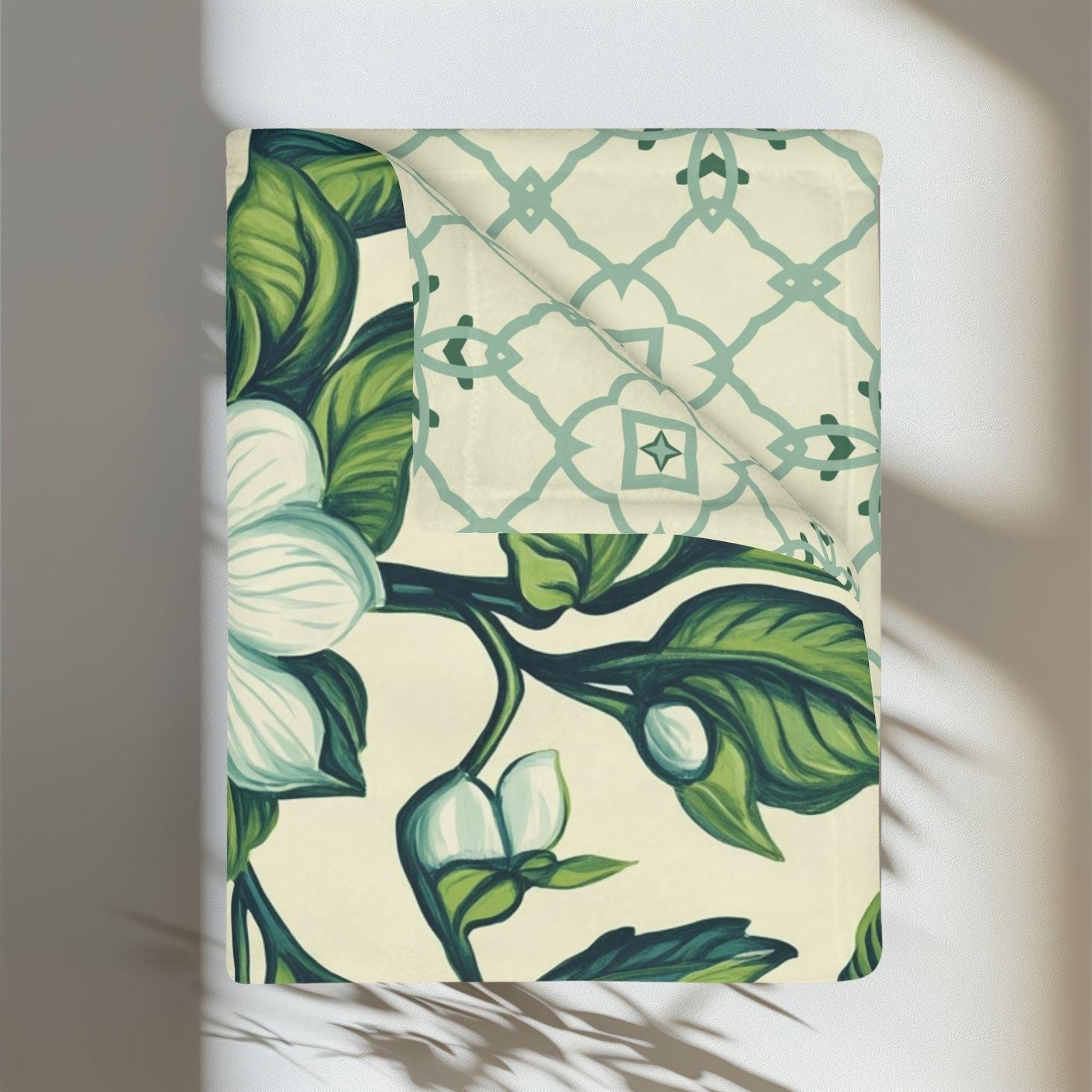 Wrap yourself in a quiet, botanical embrace. This velveteen microfiber blanket layers lush green leaves and soft, hand-drawn white blooms against a warm cream ground — one side a flowing floral vignette, the other a delicate repeating tile pattern. It feels plush and pillowy to the touch, yet light enough to carry from sofa to porch. Pull it over your knees while reading on a rainy afternoon, drape it over a favorite chair to soften a room, or fold it at the foot of the bed to add a calm, nature‑inspired accent. The two-sided design gives you an easy way to switch mood: bold, organic energy one moment; subtle, vintage geometry the next.