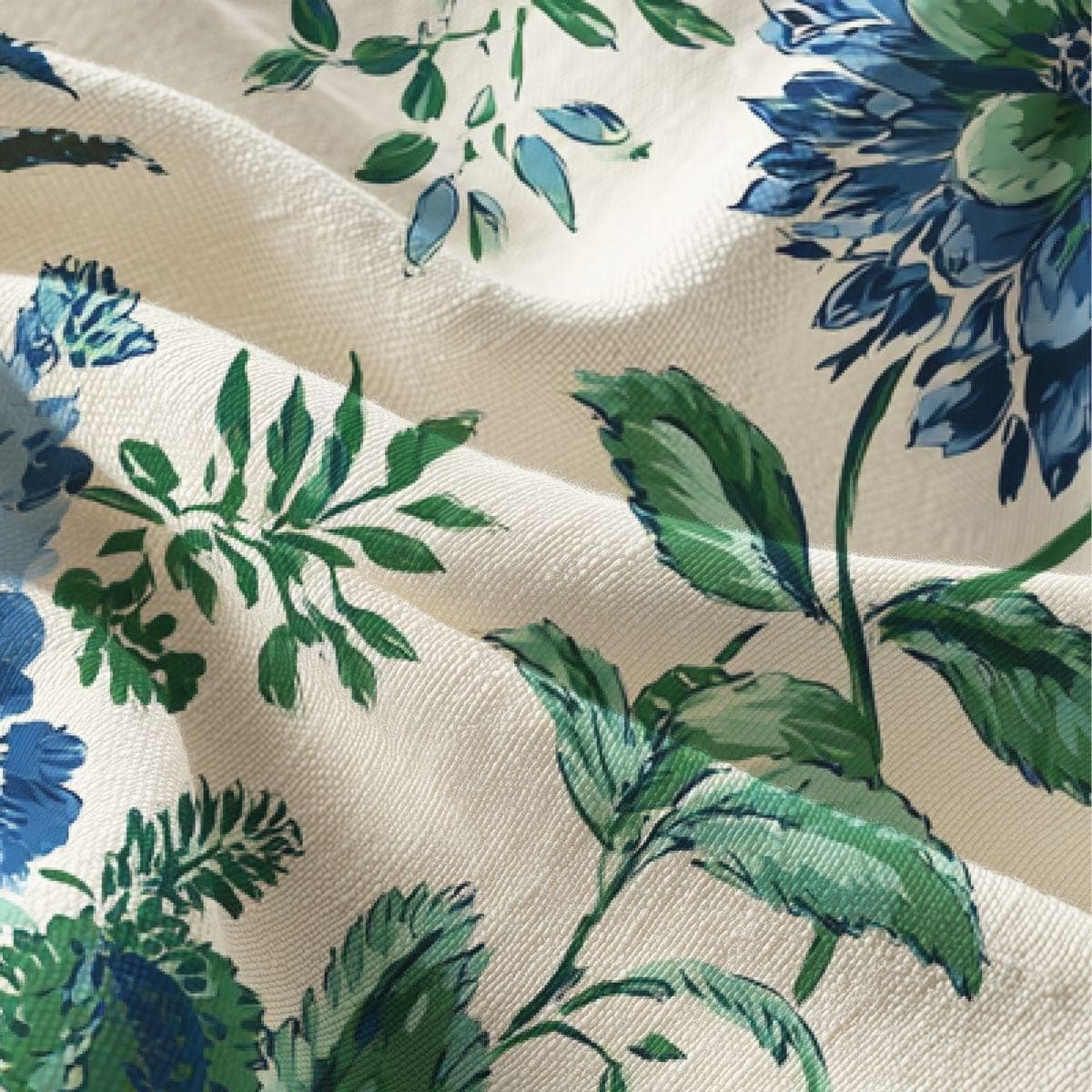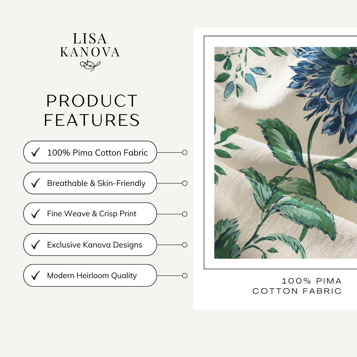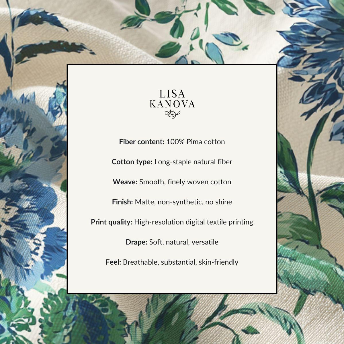 Soft, breathable fabric meets timeless floral charm. This lightweight Pima cotton piece carries a painterly blue-and-green blossom print on a warm ivory ground. It drapes gently and feels cool against the skin, inviting slow afternoons with a book or sunlit walks through a neighborhood lined with gardens. The print reads like watercolor—loose stems, layered petals, and delicate sprigs—giving the piece an artisanal, vintage-inspired mood that works equally well layered or on its own. Wear it when you want a subtle, cultivated touch that suggests calm confidence and an appreciation for hand-painted pattern-making.
