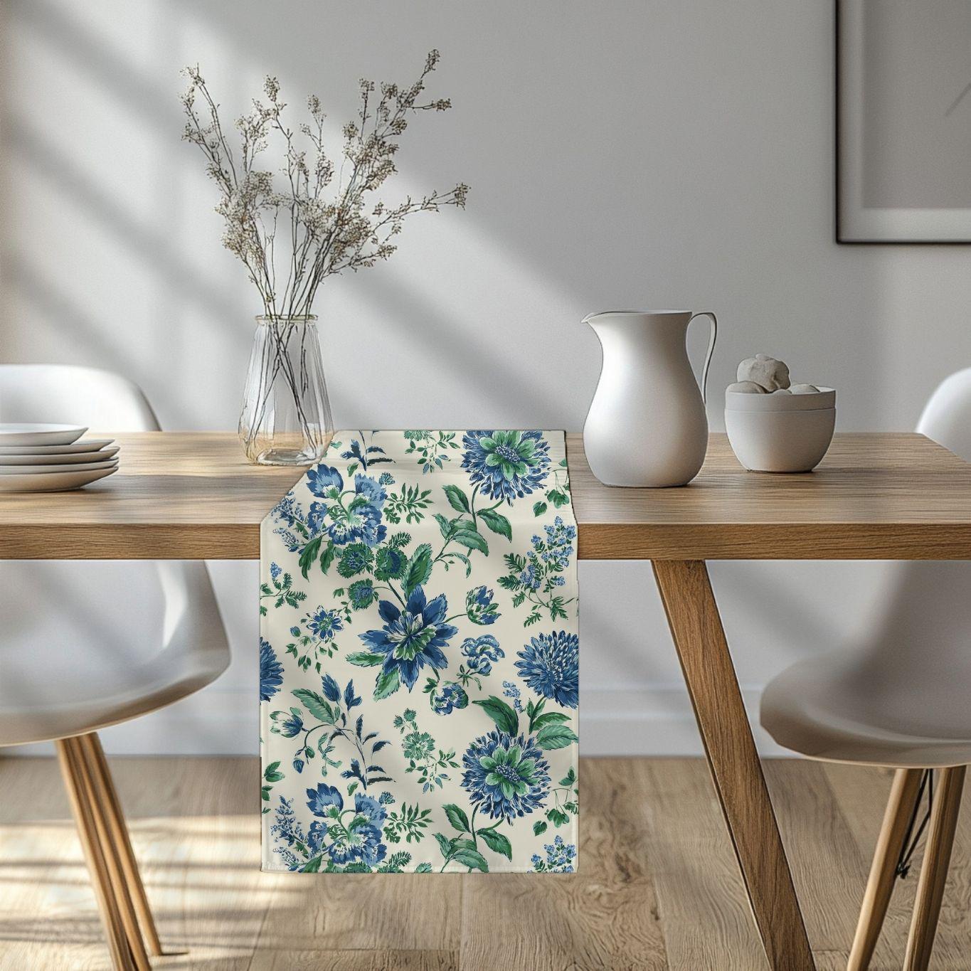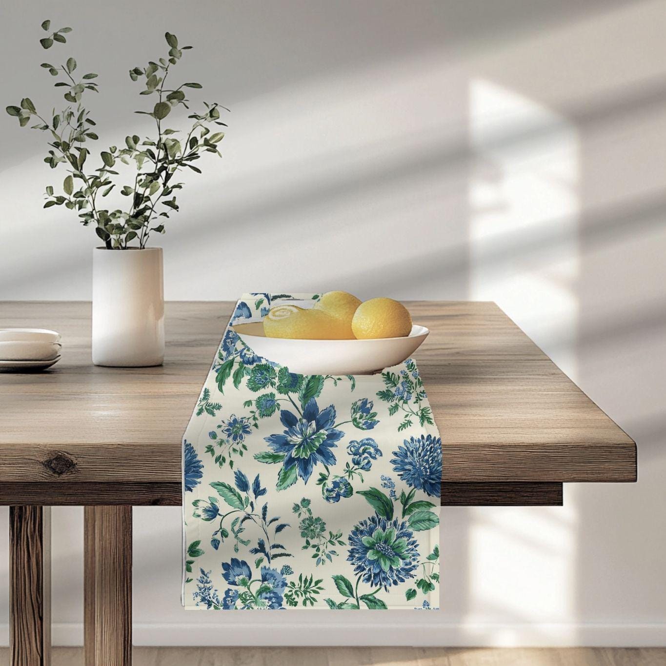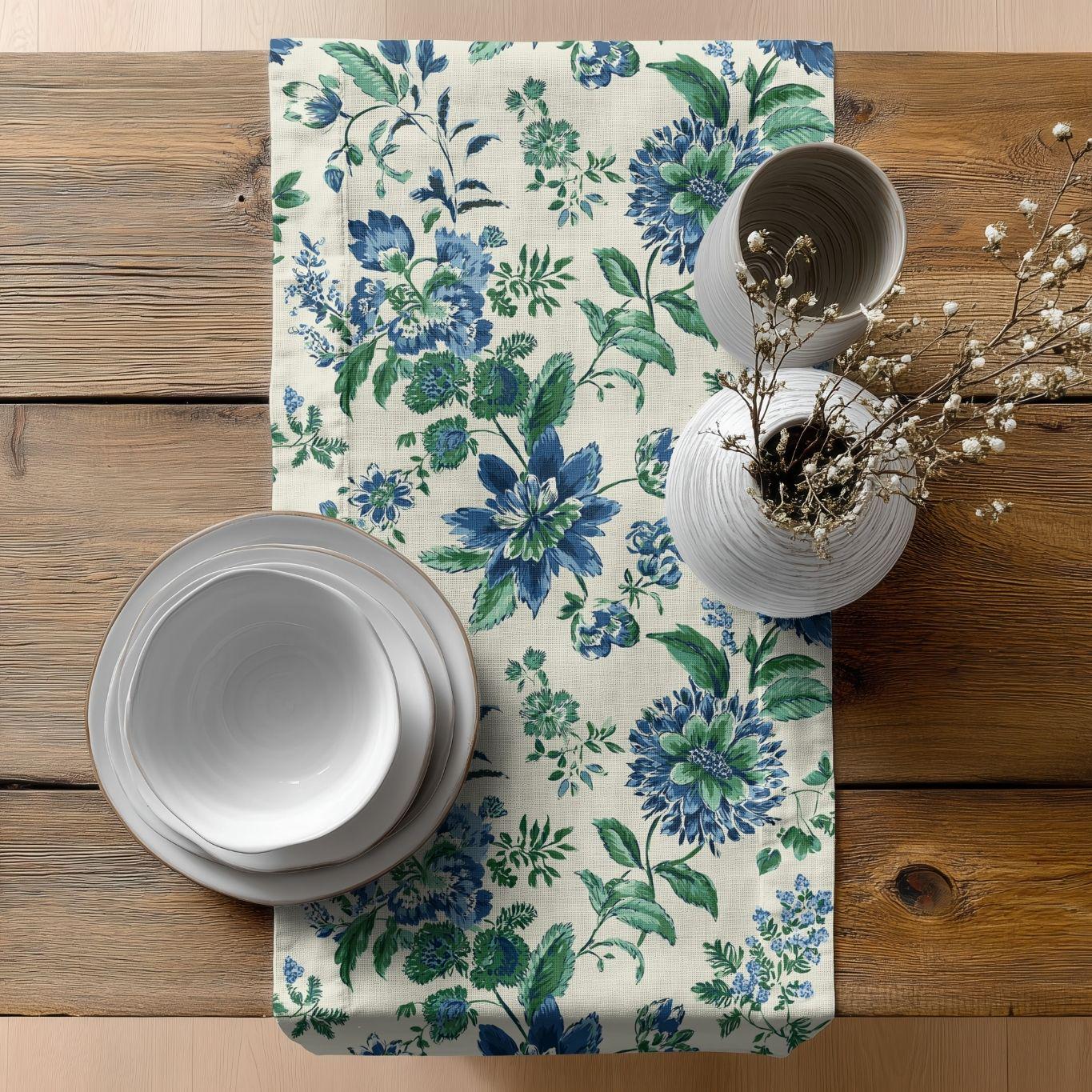 Hand-drawn blue and green blooms run along a creamy background to bring a calm, vintage garden feel to your table. Lightweight yet durable, this runner layers easily over wood or linen and adds a quietly cheerful focal point to family meals or a sunny brunch. The floral layout flows lengthwise, so each place setting catches a fresh spray of petals. Choose a soft, classic cotton twill for a muted, textured look or go with the vivid, quick-drying polyester if you want bold color and easy care. Hemmed edges keep the piece looking neat through repeated use and washing.