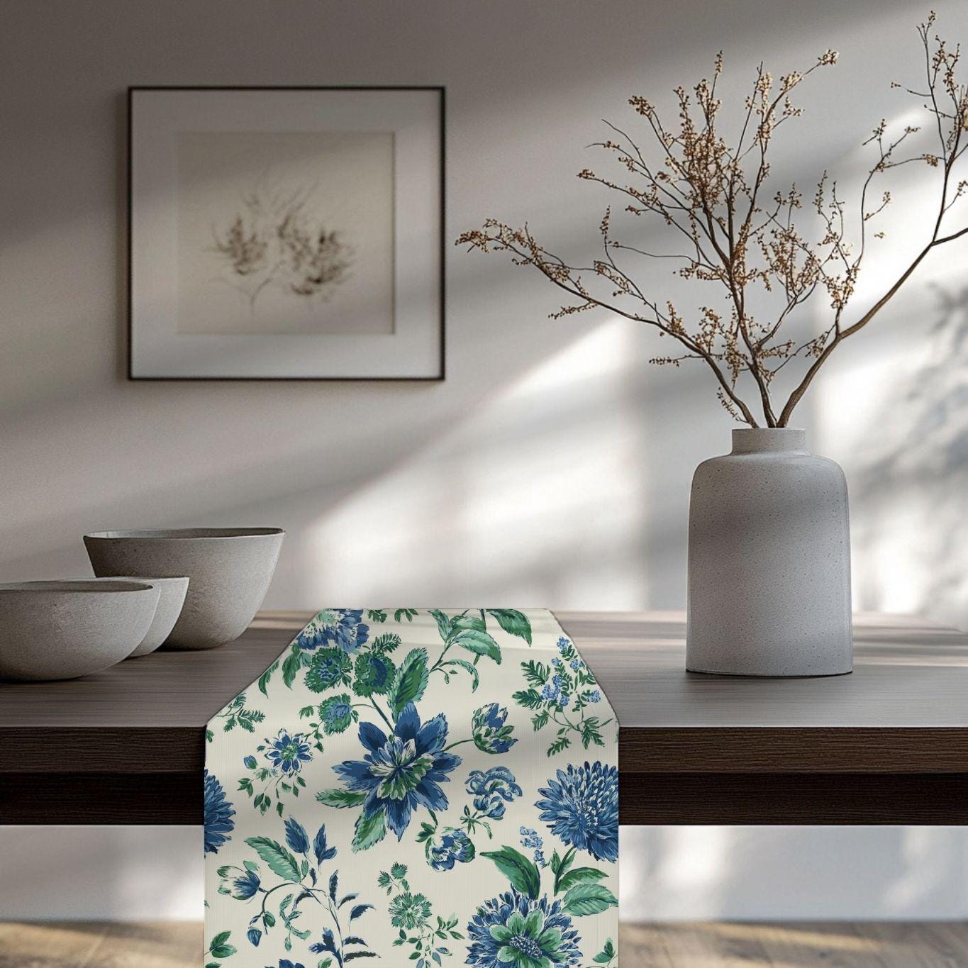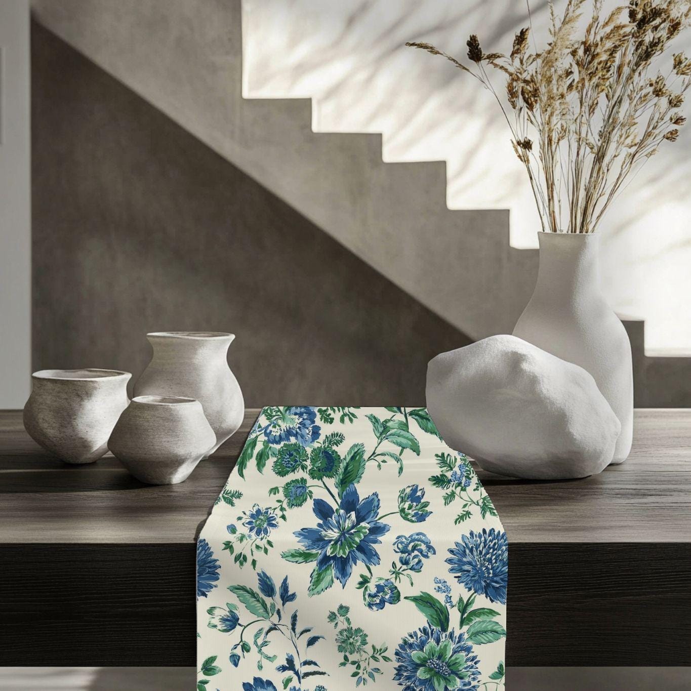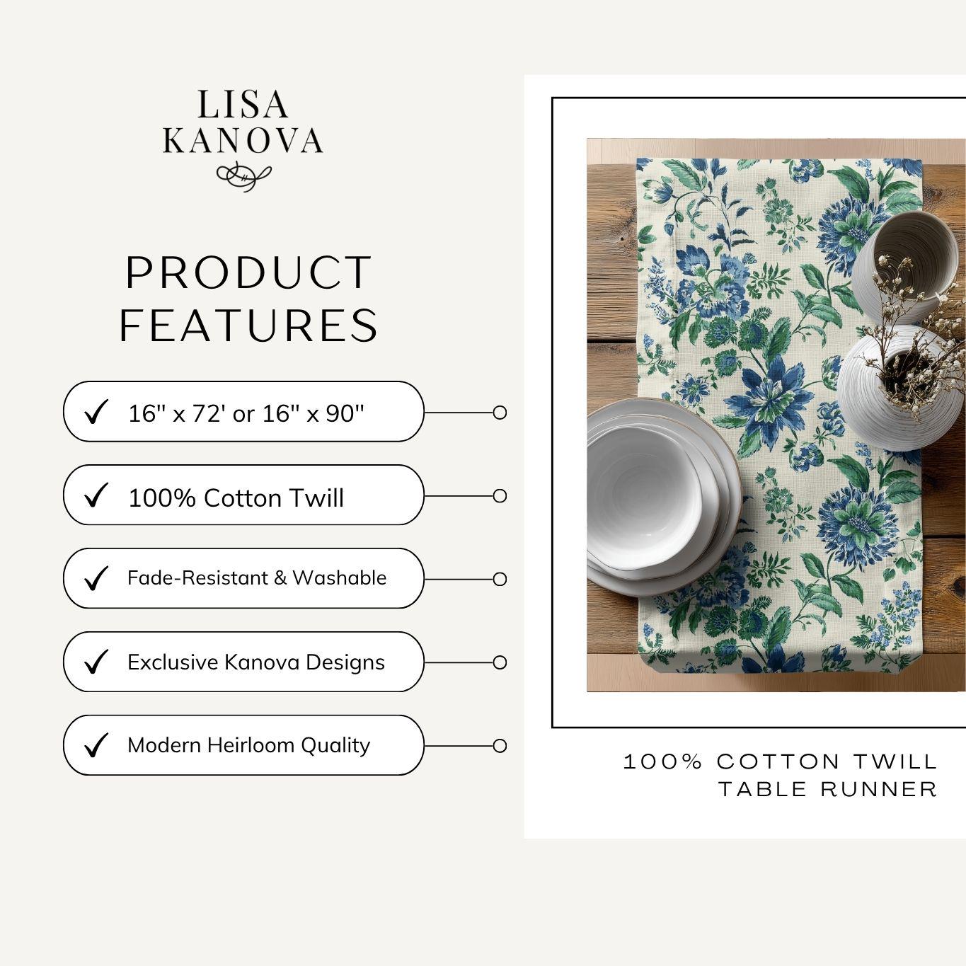 Hand-drawn blue and green blooms run along a creamy background to bring a calm, vintage garden feel to your table. Lightweight yet durable, this runner layers easily over wood or linen and adds a quietly cheerful focal point to family meals or a sunny brunch. The floral layout flows lengthwise, so each place setting catches a fresh spray of petals. Choose a soft, classic cotton twill for a muted, textured look or go with the vivid, quick-drying polyester if you want bold color and easy care. Hemmed edges keep the piece looking neat through repeated use and washing.