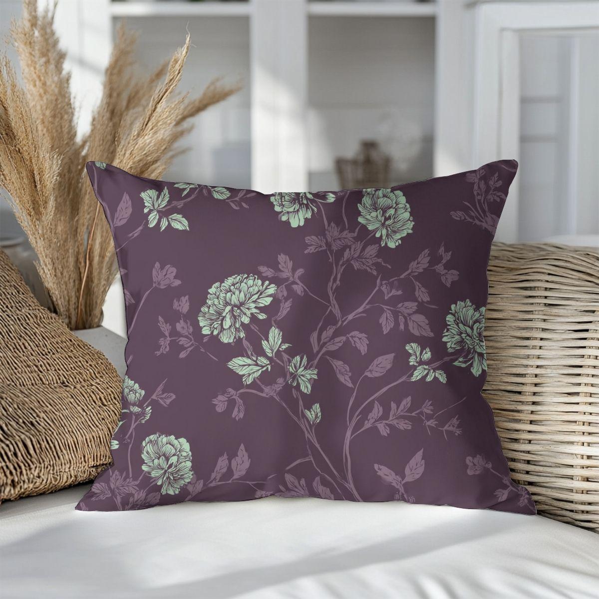 Shown here in Pretty in Plum, this balance comes through in the fabric itself. A softened plum ground creates warmth, while muted mint florals and generous spacing keep the pattern feeling light and composed. The contrast allows the color to feel cozy rather than heavy. As a throw pillow, this kind of fabric adds depth instantly — whether layered on a bed, sofa, or reading chair. It works as an accent that grounds a space without taking it over, making it easy to introduce richer color even in lighter rooms.